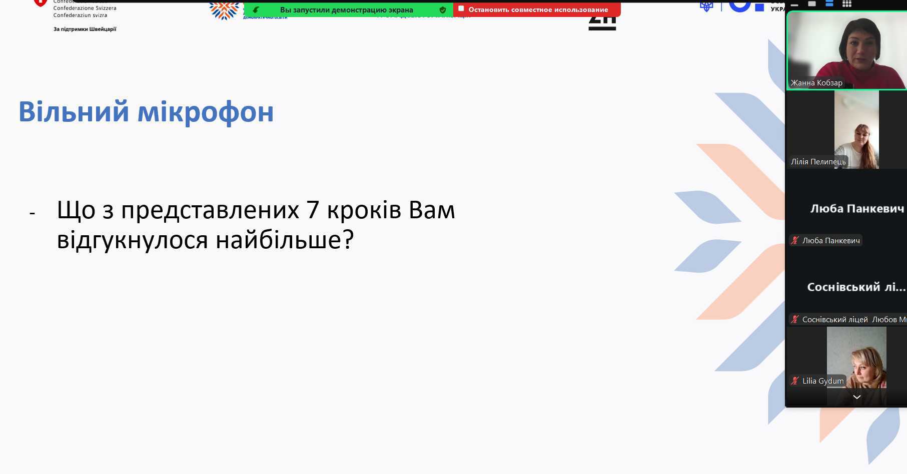Важливо, що в обговоренні активно брали участь самі учні: вони висловлювали власні думки про те, які заходи допомагають у виборі професії, чого бракує у школах та яку підтримку вони очікують від громади. Під час вправи «Вільний мікрофон» директори, кар’єрні радники та педагоги поділилися позитивним досвідом і підкреслили важливість спільної роботи, підкресливши, що ефективна профорієнтація можлива лише у форматі партнерства — коли школа, громада та родина працюють разом.