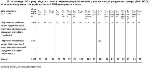 02 листопада 2023 року відділом освіти Червоноградської міської ради на складі ресурсного центру ДОН ЛОДА отримано підручники для учнів у кількості 1189 примірників, а саме