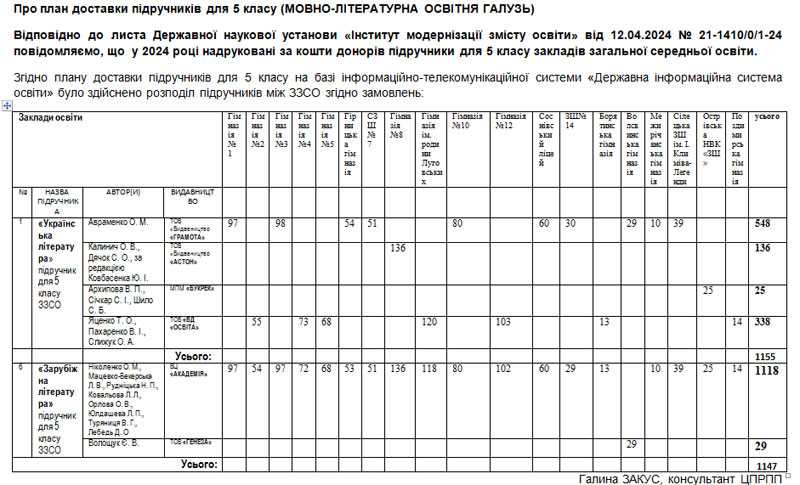 Відповідно до листа Державної наукової установи «Інститут модернізації змісту освіти» від 12.04.2024 № 21-1410/0/1-24 повідомляємо, що у 2024 році надруковані за кошти донорів підручники для 5 класу закладів загальної середньої освіти.