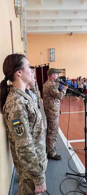 Учителька біології Гімназії N3 Шевчук Г.Я. продемонструвала учасникам заходу надання домедичної допомоги, а керівник ГО "Сокіл-Джура" і головний суддя змагань Андрій Синиця навчав учнів правильного виконання конкурсу "Впоряд".