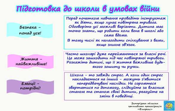 • «Шлях до школи». Якщо дитина вперше йтиме до нової школи, то пройдіть цей шлях завчасно разом. З'ясуйте всі можливі варіанти, засікайте час, оберіть найбезпечніші маршрути.