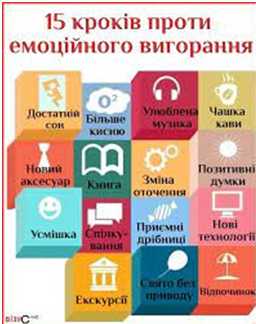 • Пошук і накопичення внутрішніх ресурсів. Так як однією з основних причин вигорання є виснаження ресурсів, тому важливо потурбуватися про себе і знайти ті справи або речі, що вас наповнюють, надають сил.