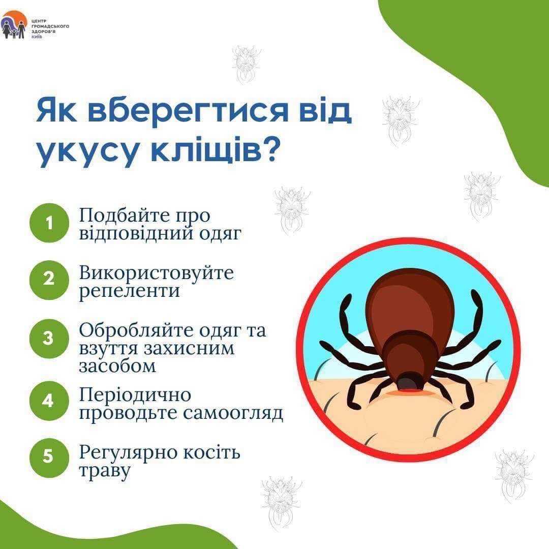Подбайте про відповідний одяг: оберіть світлий одяг із довгим рукавом, що щільно прилягає до тіла, зав’яжіть навколо шиї хустку, куртку чи сорочку заправте у штани, а їх у шкарпетки, черевики або чоботи. Залиште мінімально відкритий шкірний покрив.Використовуйте репеленти (засоби для відлякування кліщів).На прогулянці періодично проводьте самоогляд (що 2 год.) або попросіть кого-небудь з друзів, близьких оглянути вас.Обробляйте одяг та взуття захисним засобом (можна зсередини).У своєму дворі вдома або на дачній ділянці регулярно косіть траву (як правило, кліщі живуть неподалік лісів та полів).