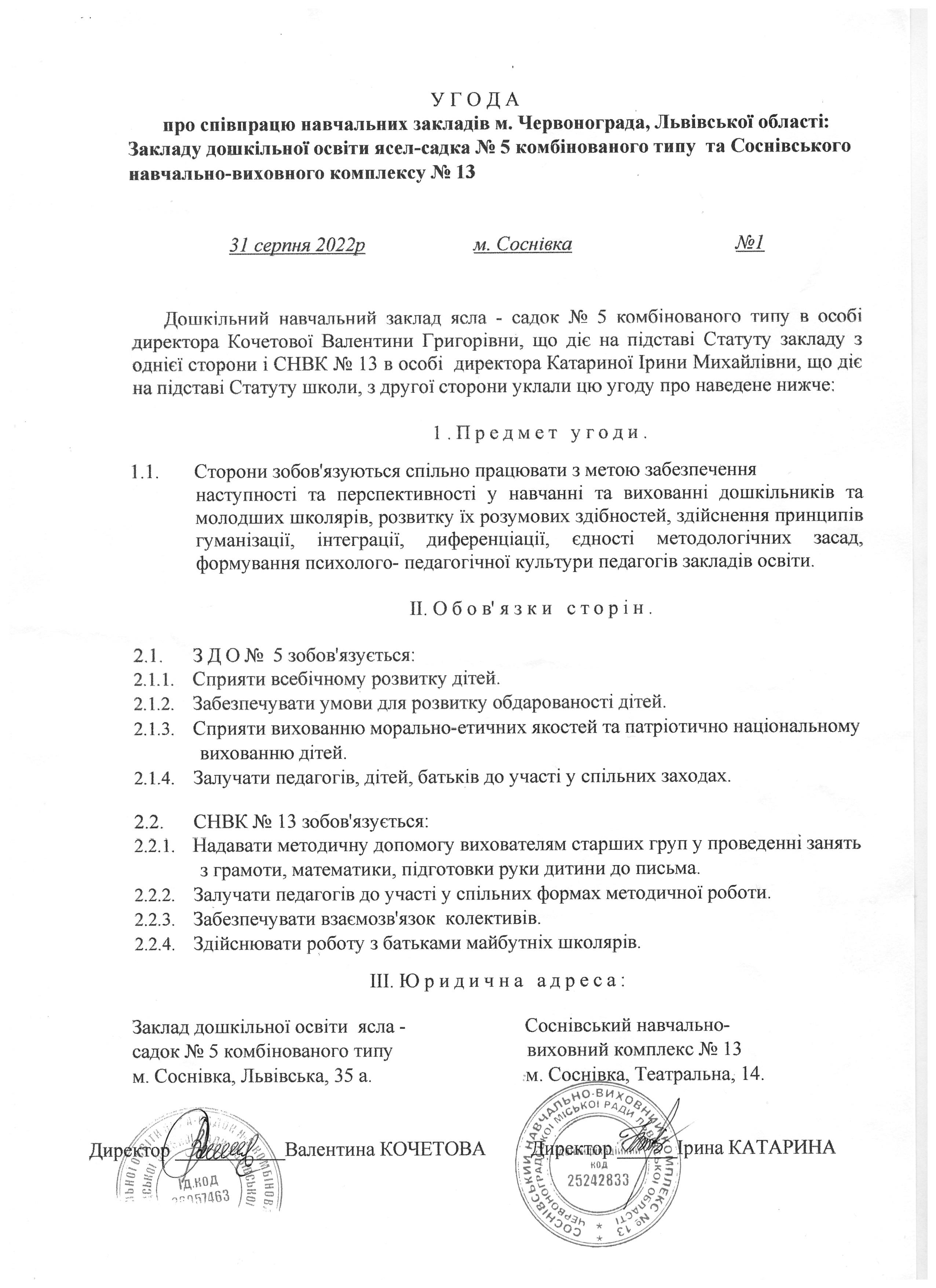 Дошкільний навчальний заклад ясла - садок № 5 комбінованого типу в особі директора Кочетової Валентини Григорівни, що діє на підставі Статуту закладу з однієї сторони і СНВК № 13 в особі директора Катариної Ірини Михайлівни, що діє на підставі Статуту школи, з другої сторони уклали цю угоду про наведене нижче: