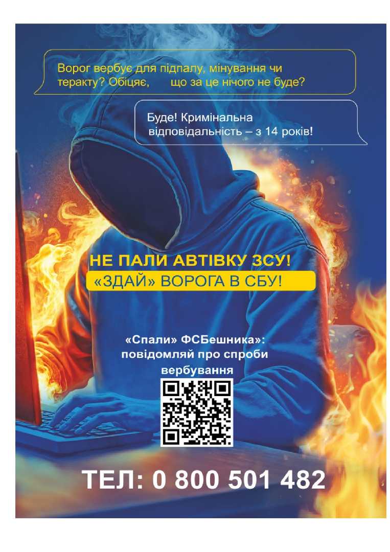 Якщо тобі або твоїм знайомим пропонують підпалити авто ЗСУ чи адмінбудівлю, влаштувати теракт чи мінування – одразу пиши нам! Не допомагай ворогу руйнувати оборону твоєї країни!