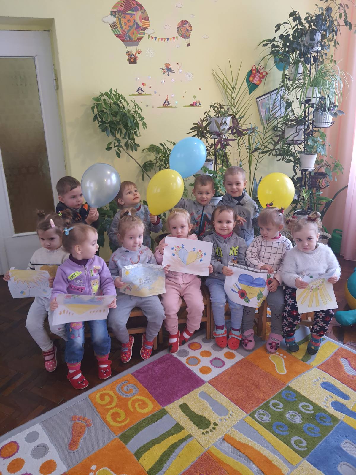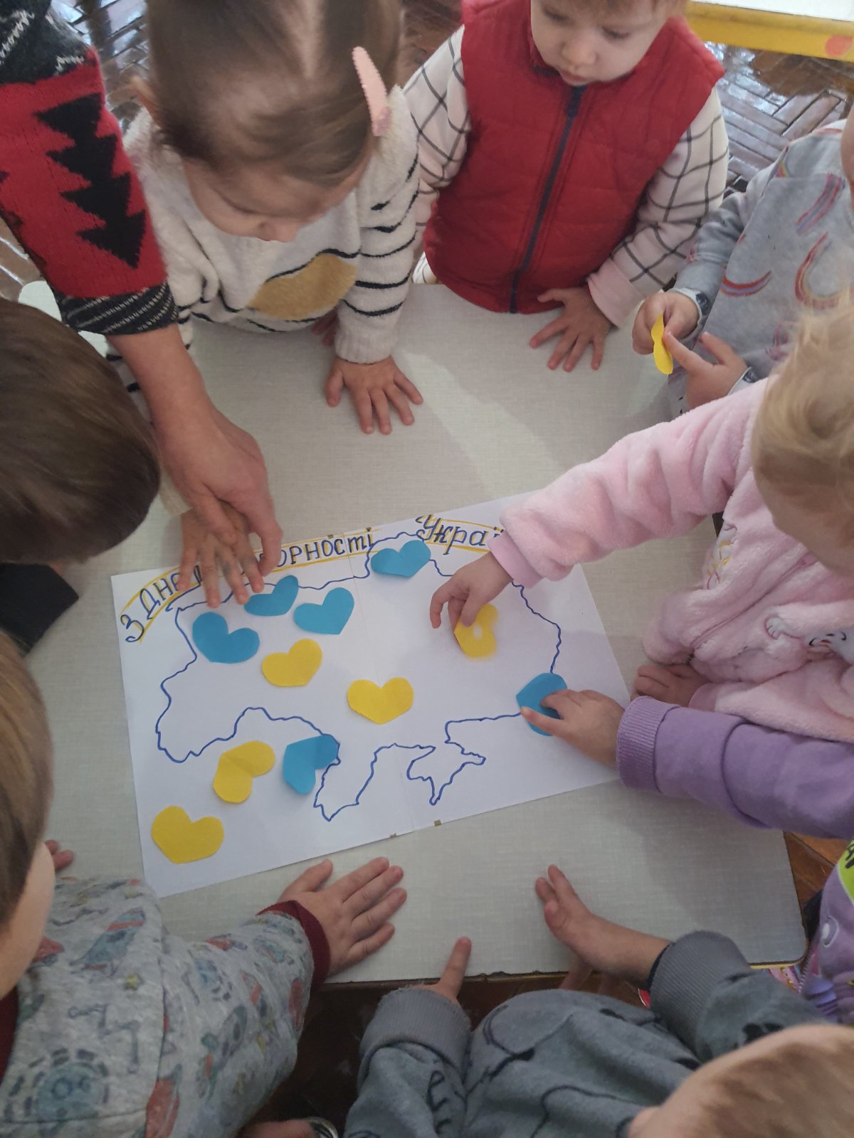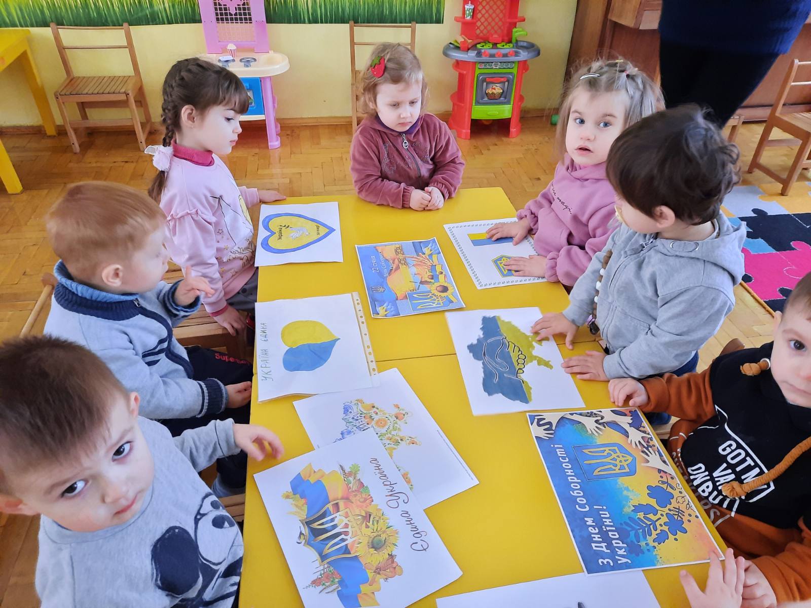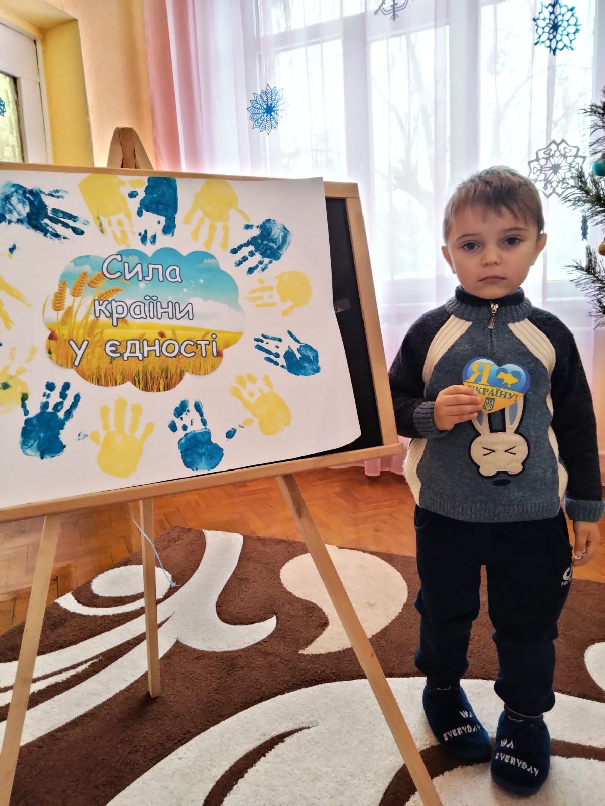 День Соборності України у нашому садочку розпочався з групи раннього віку. Малята з цікавістю виконували колетивну роботу "Україна - Єдина", створюючи карту України з жовтих та блакитних сердечок. Маленькими долоньками, у національних тонах малювали плакат "Сила країни у єдності".