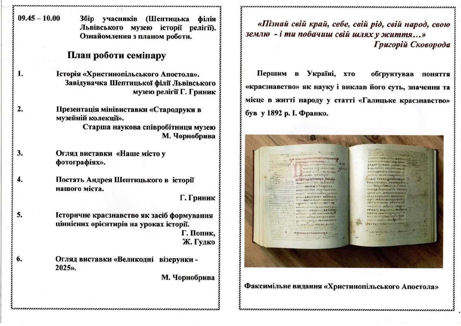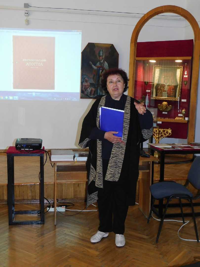 Галина Гриник, завідувачка Шептицької філії музею, ознайомила учасників семінару з історією унікальної пам’ятки (ймовірно ХІІ століття) – «Христинопільський Апостол» (назва походить від місця знахідки у ХVІІІ ст.), а також з цікавими фактами про життя і діяльність Андрея Шептицького, митрополита УГКЦ, мецената, банкіра, просвітителя…, на честь котрого перейменовано наше місто.