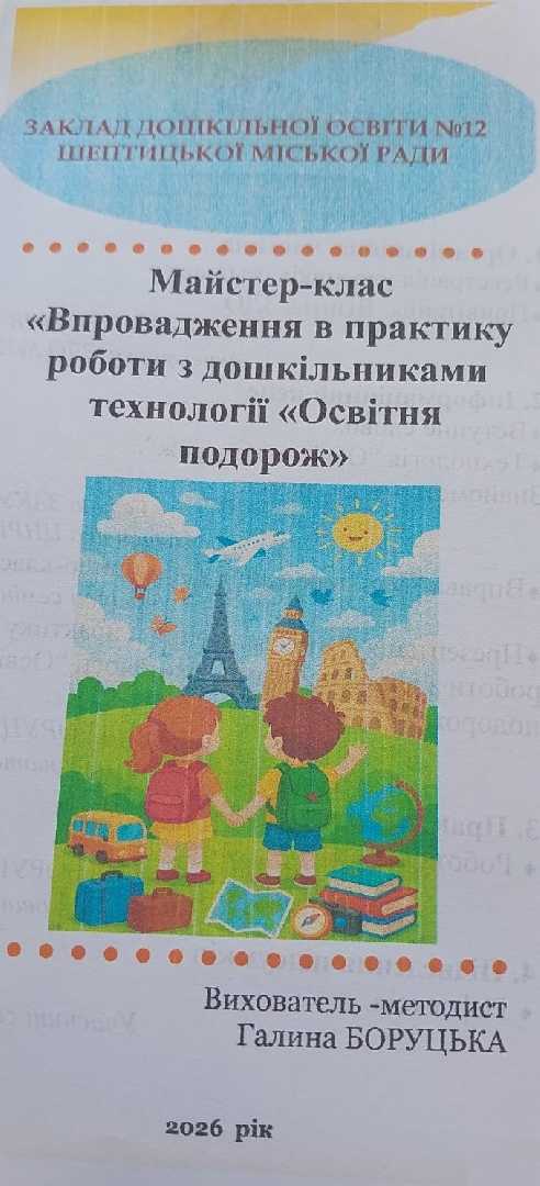 13 січня 2026 року в ЗДО № 12 відбувся майстер-клас для вихователів закладів дошкільної освіти Шептицької міської ради на тему «Впровадження в практику роботи з дошкільниками технології «Освітня подорож»», спрямований на підвищення професійної майстерності та методичної компетентності педагогів дошкілля.