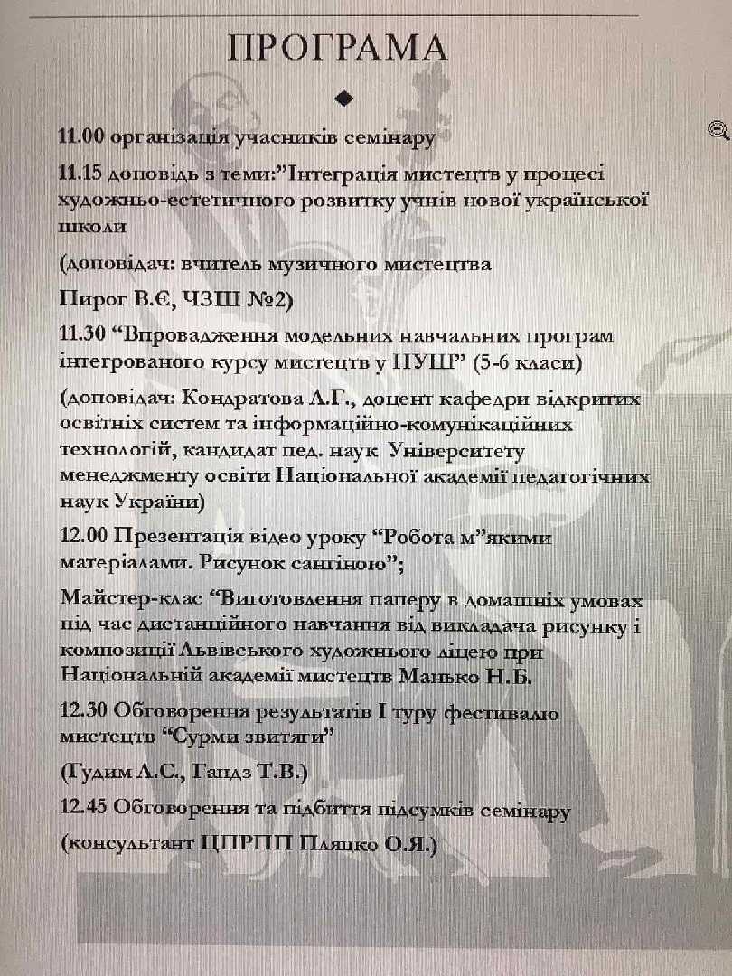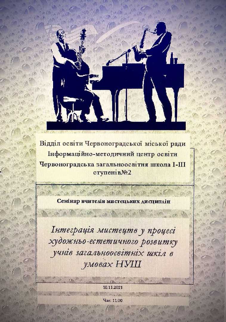 Перевагою онлайн семінарів є той факт, що можна об'єднати однодумців з різних куточків України, мати можливість обговорити актуальні теми, отримати інформацію та консультацію фахівців щодо питань, які виникають в освітньому процесі, обмінятись досвідом роботи. Саме таким був семінар вчителів мистецької освітньої галузі, що відбувся 10 листопада 2021 року. Тема семінару: «Інтеграція мистецтв у процесі художньо-естетичного розвитку учнів загальноосвітніх шкіл в умовах НУШ», яку обрав учитель музичного мистецтва ЧЗШ №2 Володимир Пиріг, є надзвичайно важливою у період впровадження Державного стандарту базової середньої освіти. У своїй доповіді Володимир Євгенович розповів про можливості інтегрованого навчання, що сприяє формуванню в учнів естетичного ставлення до дійсності і мистецтва.