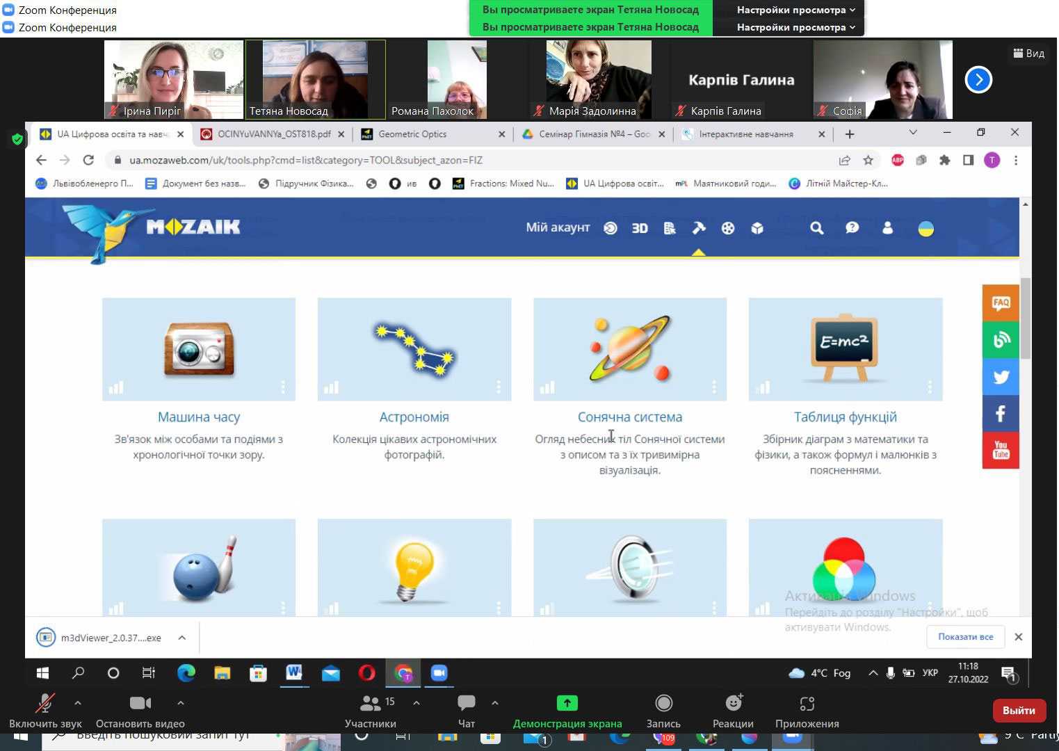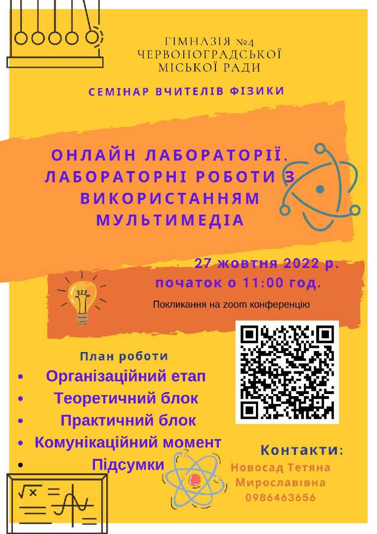 27.10.2022 відбувався онлайн семінар для вчителів фізики з теми "Онлайн лабораторії. Лабораторні роботи з використанням мультимедіа". Вчитель фізики Червоноградської Гімназій #4 Тетяна Мирославівна Новосад продемонструвала колегам цифрові, інтерактивні інструменти для використання на уроках фізики.