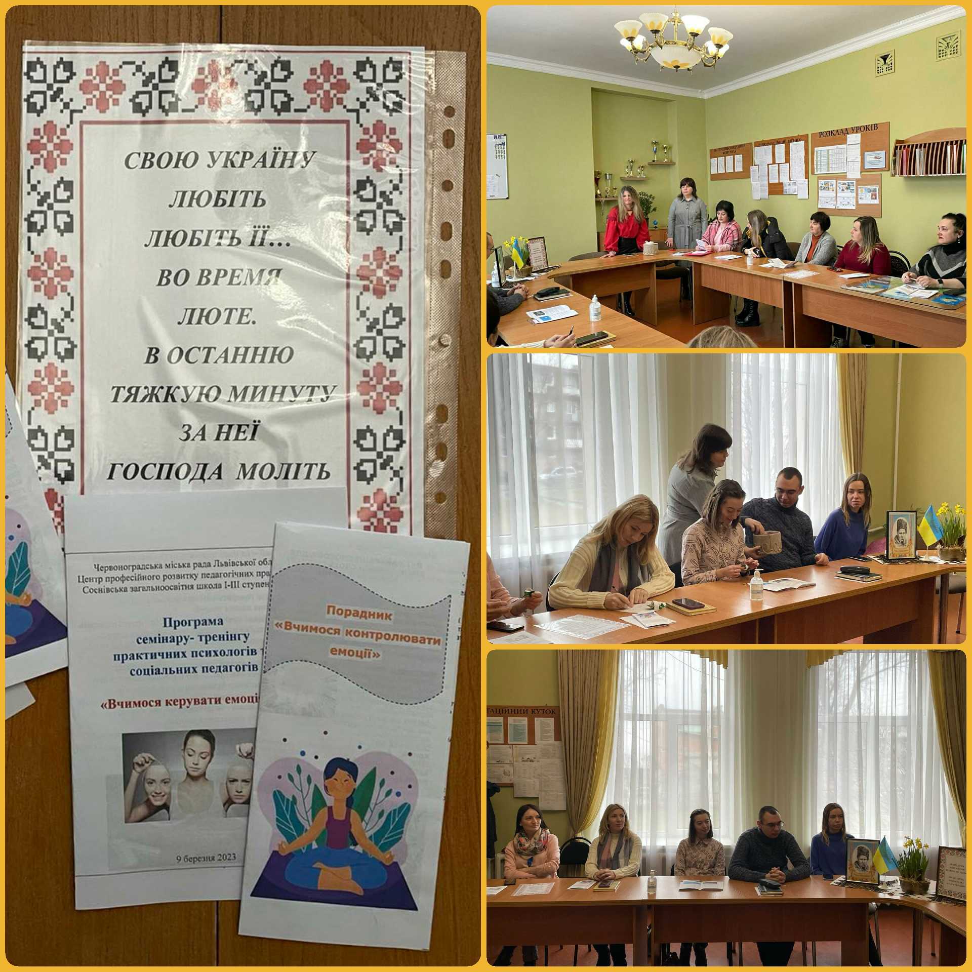 9 березня 2023 року в стінах гостинної Соснівської загальноосвітньої школи №14 відбувся семінар-практикум на тему "Вчимося контролювати емоції. Розвиток емоційної компетентності педагога» для працівників психологічної служби закладів загальної середньої освіти.
