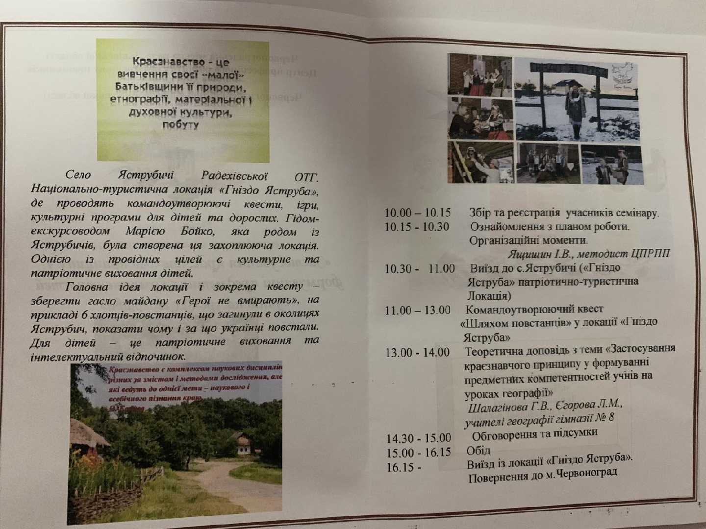 Педагоги Червоноградського району відвідали «Гніздо Яструба» та почали з квестової краєзнавчої гри «Шляхом повстанців»,яка ґрунтується на командній роботі. Завдяки згуртованості та хорошого настрою учасники семінару розгадали усі загадки та пройшли всі перешкоди.