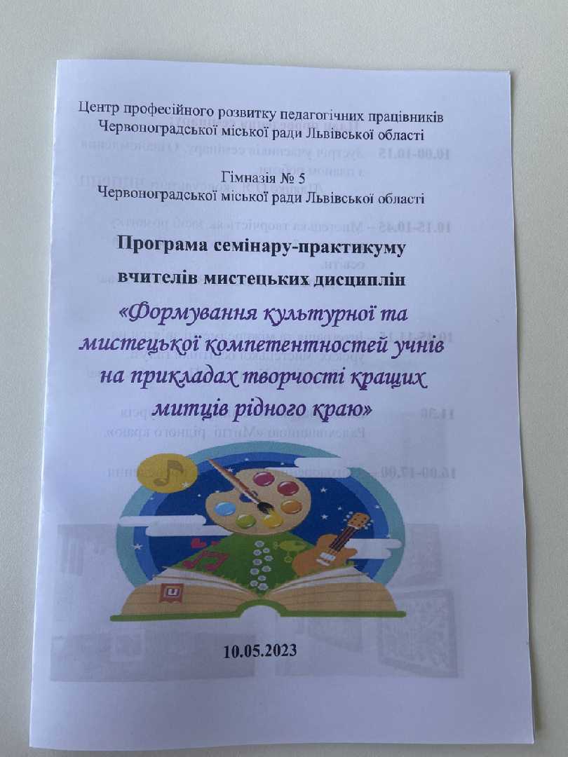 Кожна зустріч спільноти вчителів мистецької галузі - це зустріч дружнього, творчого, натхненного колективу однодумців готового до нових ідей, креативності, вдосконалення свого професійного рівня. Невинятковою стала зустріч 10 травня вчителів музичного та образотворчого мистецтва ЗЗСО Червоноградської міської ради. Програма семінару на тему: «Формування культурної та мистецької компетентностей учнів на прикладах творчості кращих митців рідного краю», який організували вчителі Гімназії №5 Тетяна Гандз та Світлана Костюк у співдружності з Ольгою Пляцко, консультантом ЦПРПП, була насиченою як теоретичним, так і практичним змістом.