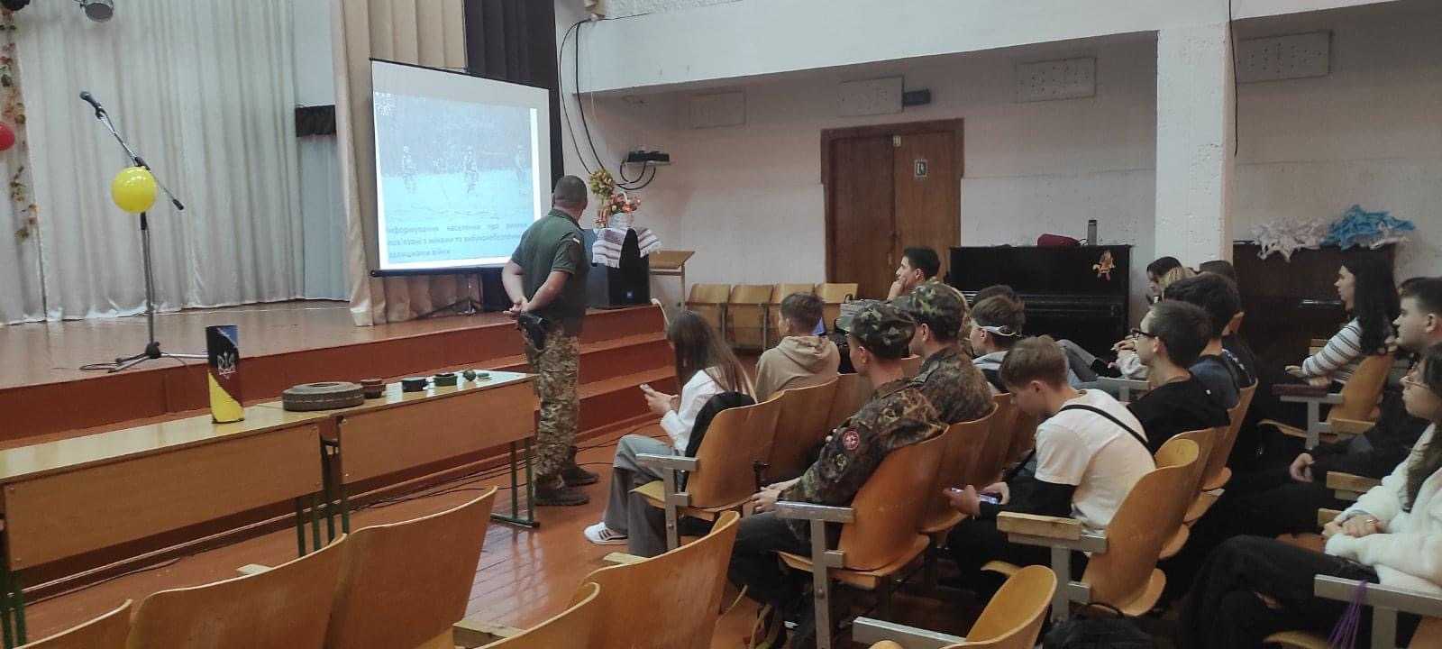 З учнями 9-х класів працювали військовослужбовці в/ч Т 0200 , які вчили учнів поводженню з вибухонебезпечними предметами.