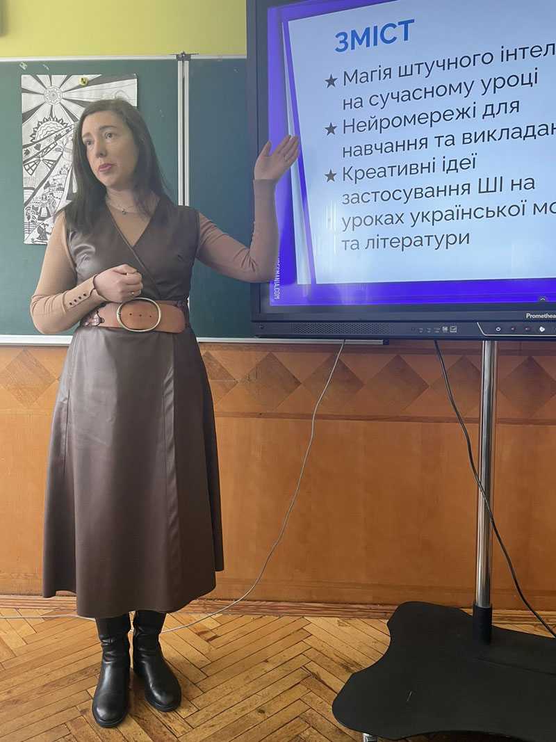Надія Пащук, консультантка ЦПРПП, акцентувала на ролі інформаційної грамотності вчителя в час засилля ворогом ІПСО з використанням можливостей штучного інтелекту. Підсумувала, що ШІ ніколи не замінить живого слова, блиску в очах, душі вчителя, але може стати потужним арсеналом серед методичного навчального інструментарію. Подякувала дирекції та вчителям Червоноградського ліцею за чітку організацію роботи семінару.