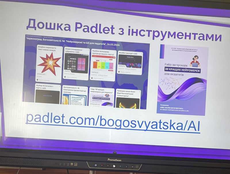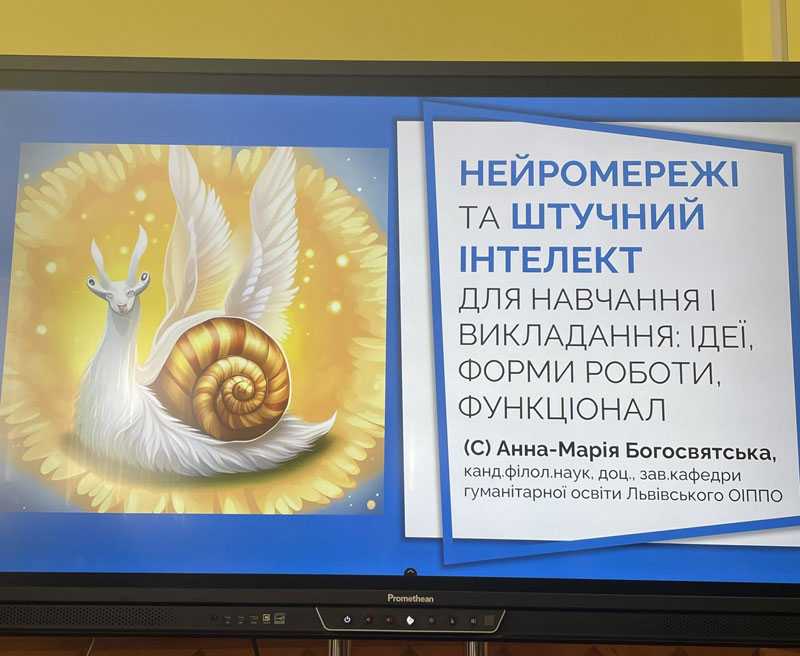 У роботі семінару взяла участь Анна-Марія Богосвятська, кандидатка філологічних наук, доцентка, завідувачка кафедри гуманітарної освіти Львівського ОІППО. Вона презентувала напрацювання з теми «Нейромережі та штучний інтелект для навчання і викладання: ідеї, форми роботи, функціонал». Охарактеризувала найпопулярніші мережі, інструментарій ШІ та продемонструвала креативні ідеї їхнього використання в освітньому процесі на різних етапах уроків української та зарубіжної літератури. Вчителі мали змогу на дошці Padlet за допомогою нейромереж Emojiton, Dream, ChatGpt, BeatBot, HueHive, MyMap AI під керівництвом Анни-Марії генерувати зображення, різноманітні тексти, музику, конспекти, ментальні карти.