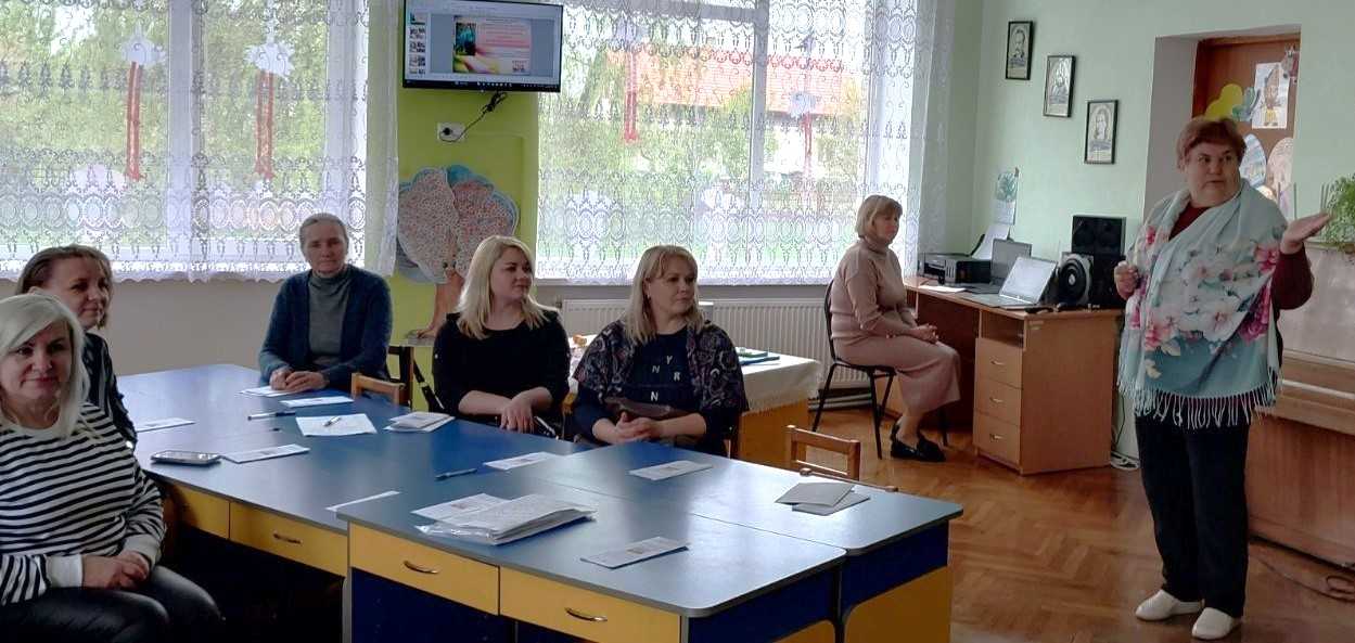 Віра МИКОЛАЙЧУК, директор ЗДО с. Волсвин зустріла учасників семінару і розказала про діяльність закладу та досвід роботи їхнього музичного керівника.