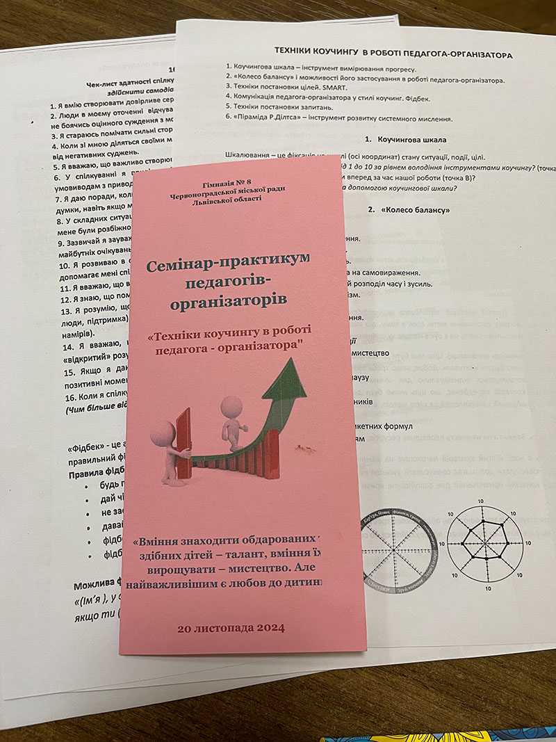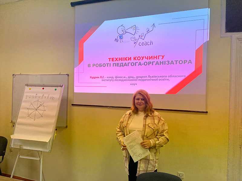 Про віхи становлення коучингу, стратегію постановки запитань, інструменти та коучинговий стиль мислення, цілі та безоцінність, майстерність ведення діалогу, комунікативне партнерське співробітництво, розповіла педагогом Ліліана Кудрик. Слід відзначити цінність практичної складової зустрічі, яку підготувала Ліліана Григорівна. Учасники семінару вимірювали рівень розвитку своєї коучингової компетентності за допомогою шкалювання, визначили свої сильні сторони за допомогою техніки «Колесо балансу», ставили «розумні цілі» за методикою SMART, здійснювали самодіагностику, ставили запитання планування, «7 кроків до себе», обмінювались відгуками «фідбек», аналізували особистість за технікою «Піраміда Ділтса».