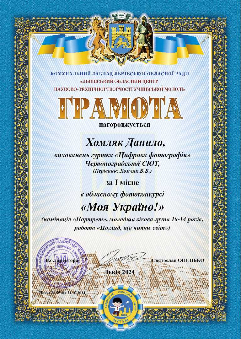 Перемога у фотоконкурсі "Моя Україна" 2024р. Керівник гуртка Хомляк Вікторія Вікторівна