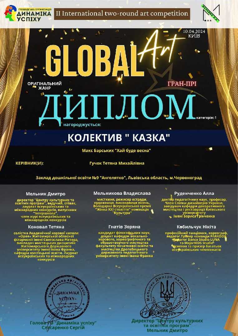 Вітаємо колектив «Казка» з отриманням ГРАН ПРІ у міжнародному двотуровому конкурсі мистецтв «GLOBAL ART” з музичним номером «ХАЙ БУДЕ ВЕСНА». Музичний керівник Гучок Тетяна Михайлівна.
