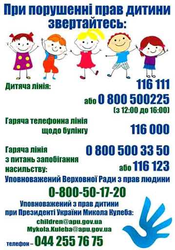 Національна дитяча «гаряча» лінія 0 800 500 225 або 116 111 (для дзвінків з мобільного)