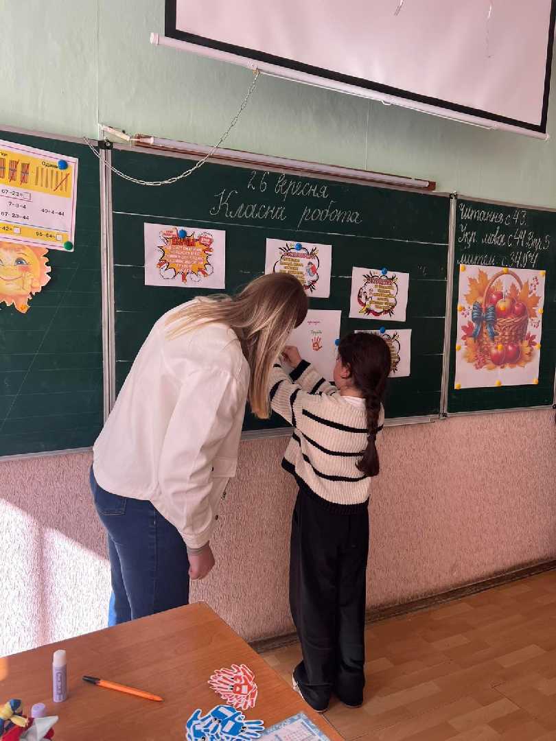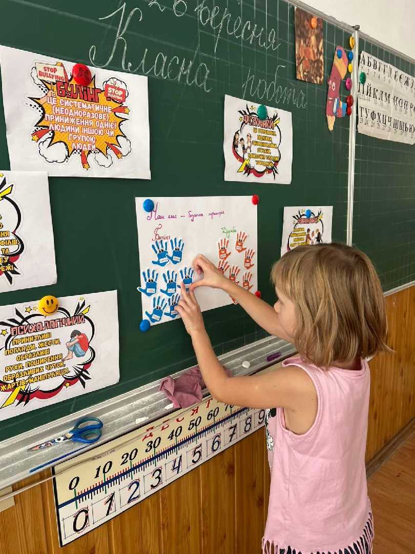 Завершальним етапом стало створення постеру «Наш клас – безпечна територія». Діти написали на кольорових долоньках, які вчинки належать до булінгу, а які — до дружби.