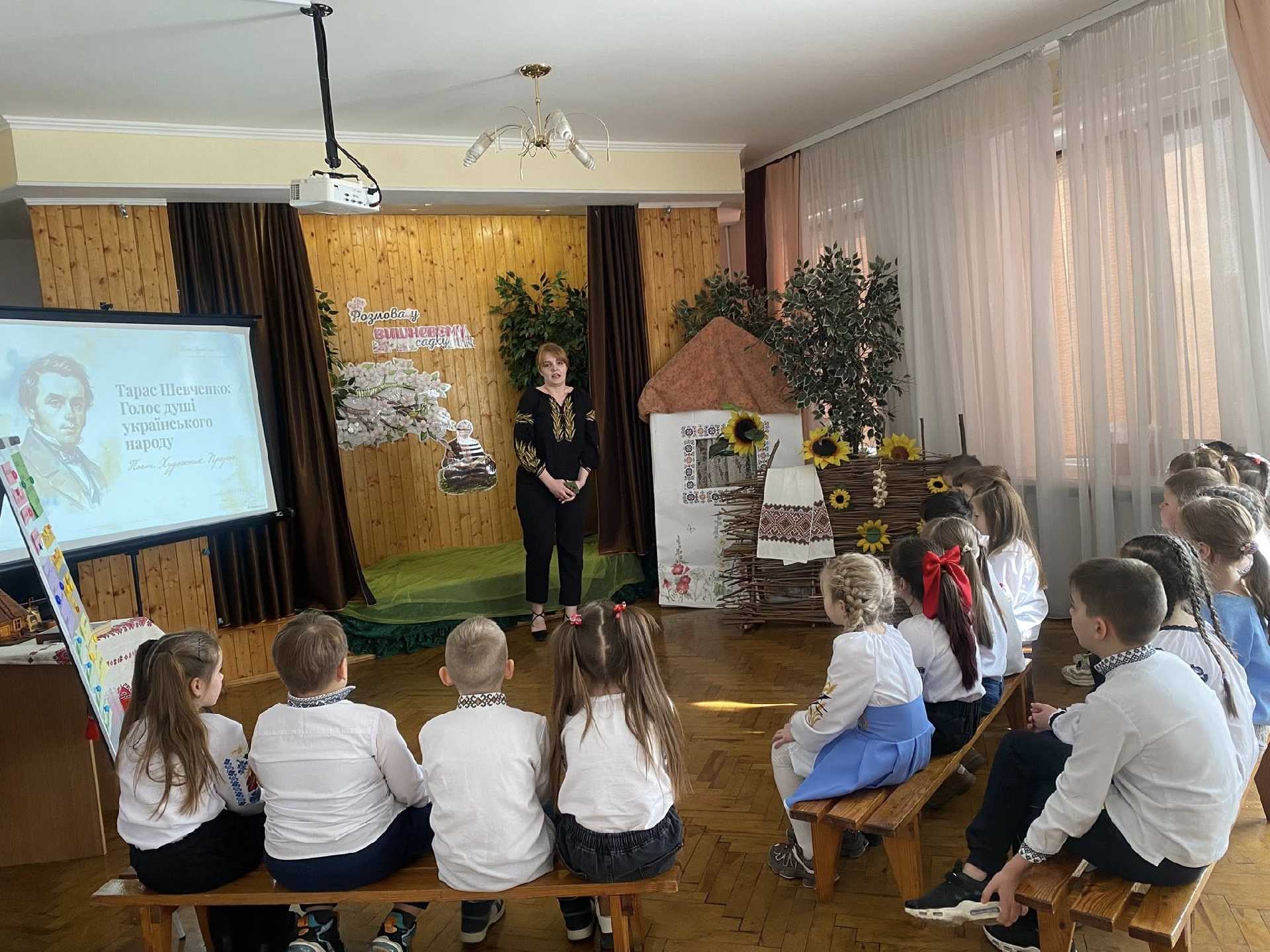 Шевченківські_дні_у_школі Бібліотекар школи Надія Федечко запросила учнів 2-А, 2-Б та 3-В класів на теплу і цікаву зустріч «Розмова у вишневому саду», присвячену творчості Тараса Шевченка. Діти пригадали життєвий шлях великого Кобзаря, із задоволенням читали напам’ять його вірші, слухали пісні на слова поета. Також учні виконували цікаві інтерактивні завдання, які були розміщені на символічній гілочці вишні з ніжними квітами. Найбільше емоцій у дітей викликав «оживлений» образ Тараса Шевченка. Зустріч ще раз нагадала всім мудрі слова Кобзаря: "Учітесь, читайте, і чужому научайтесь, й свого не цурайтесь.