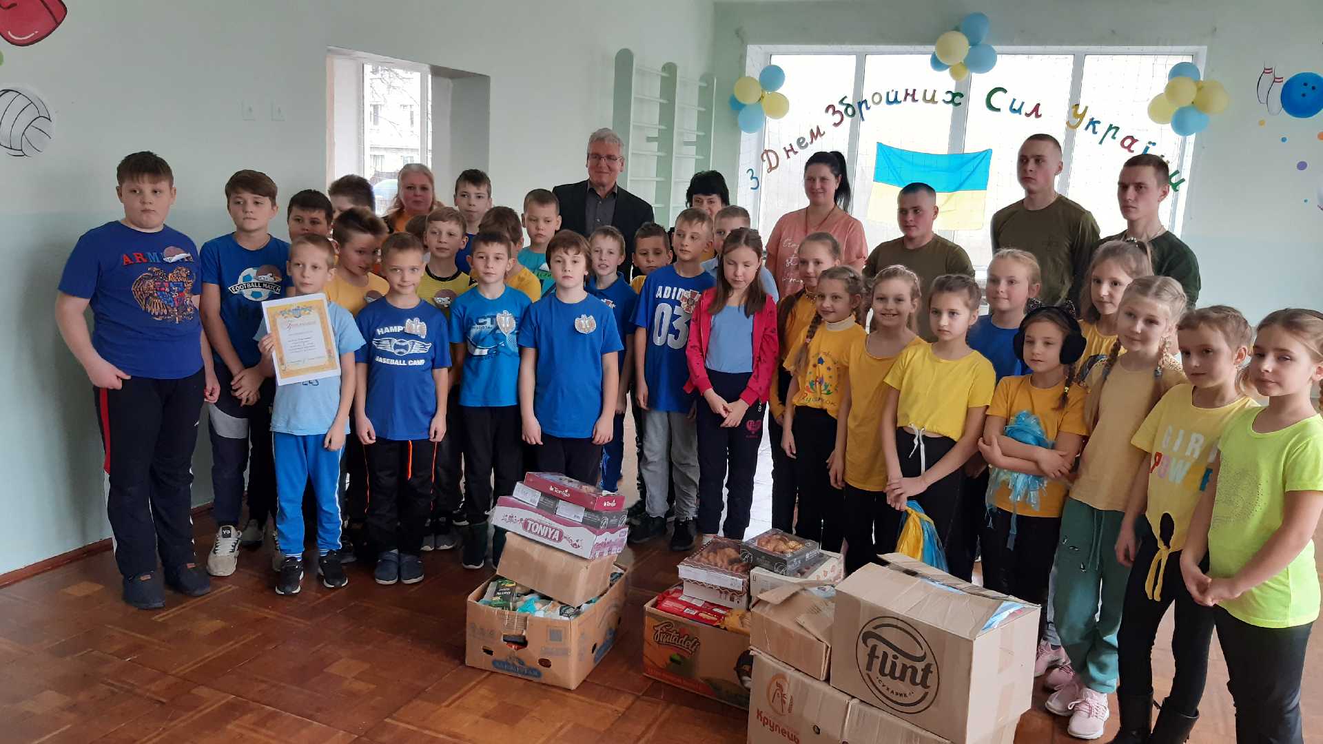 З нагоди свята для військовослужбовців учні, батьки та працівники школи зібрали солодощі, засоби гігієни та листівки з привітаннями.
