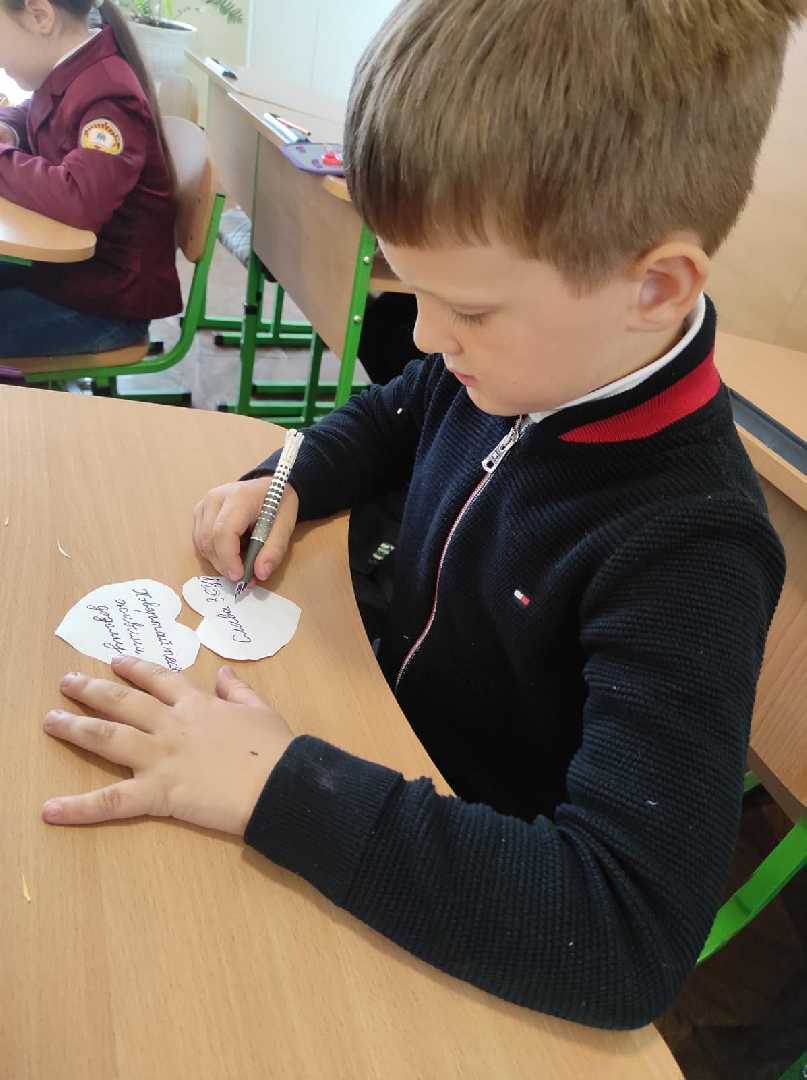 Наймолодші учні нашої школи ( 1-Б клас, вчитель Пташкограй О.М) виготовили "патріотичну валентинку" для військових ЗСУ