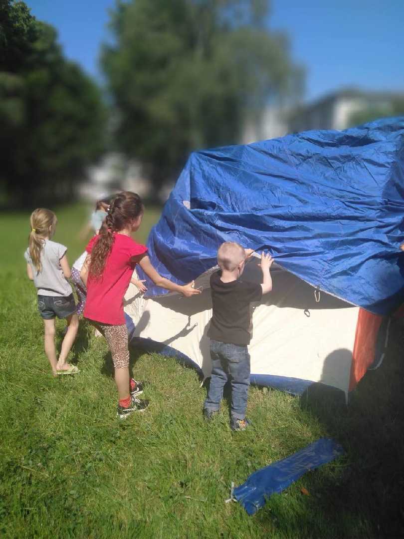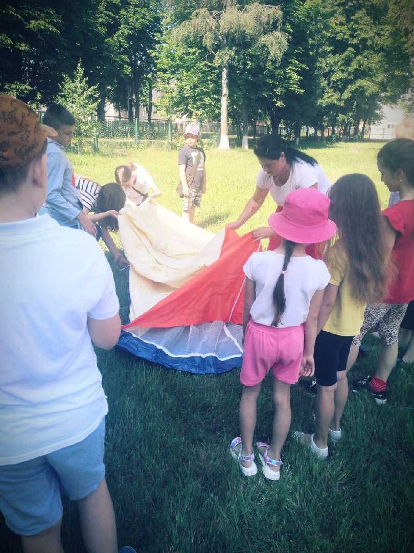 Сьогодні на шкільному подвір’ї нашої школи було гамірно та весело, адже розпочалися канікули і школярі долучилися до фізкультурно – оздоровчих занять «Активне літо для українських дітей». Перше заняття «Ми збираємось в похід» провела вчитель фізкультури Качала Світлана Андріївна. Вона розповіла дітям що потрібно брати із собою в подорож,  що покласти в рюкзак і як бути з їжею, про що треба пам'ятати у подорожі. Але найважливіше для туриста в поході – намет. Саме тому Світлана Андріївна навчала юних мандрівників швидко і правильно встановлювати намет. Також діти грали в рухливі ігри та виконували руханки під музику.