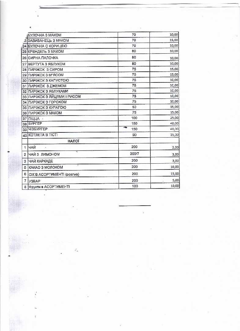 Вартість страв для вільного вибору відвідувачів