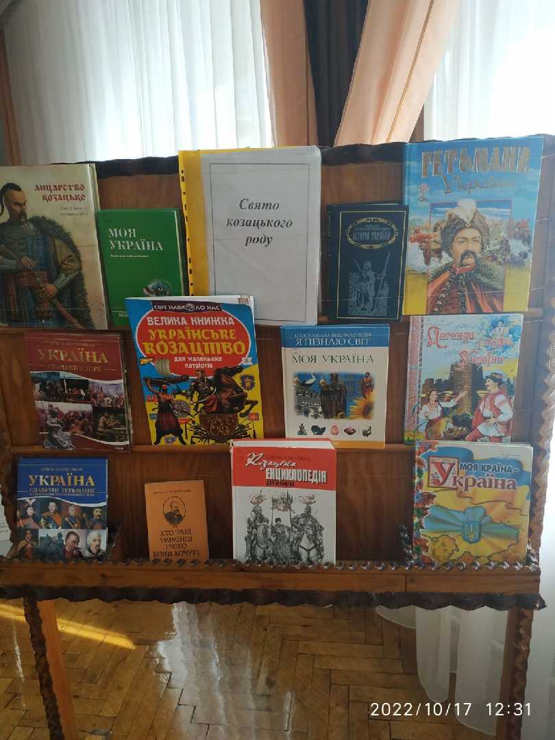 14 жовтня, на свято Покрова, щорічно відзначається День українського козацтва.Свято Покрова було головним святом козацької вольниці.Українці пишаються культурною спадщиною козаків та їх боротьбою за нашу національну ідею.Ідея козацтва жива і донині .У кожному з нас тече кров наших предків-вільних і незалежних козаків.З 2014 року в цей день святкується і День захисників і захисниць України.До Дня українського козацтва шкільна бібліотека презентує огляд літератури та яскраву, цікаву книжкову виставку"Свято козацького роду"