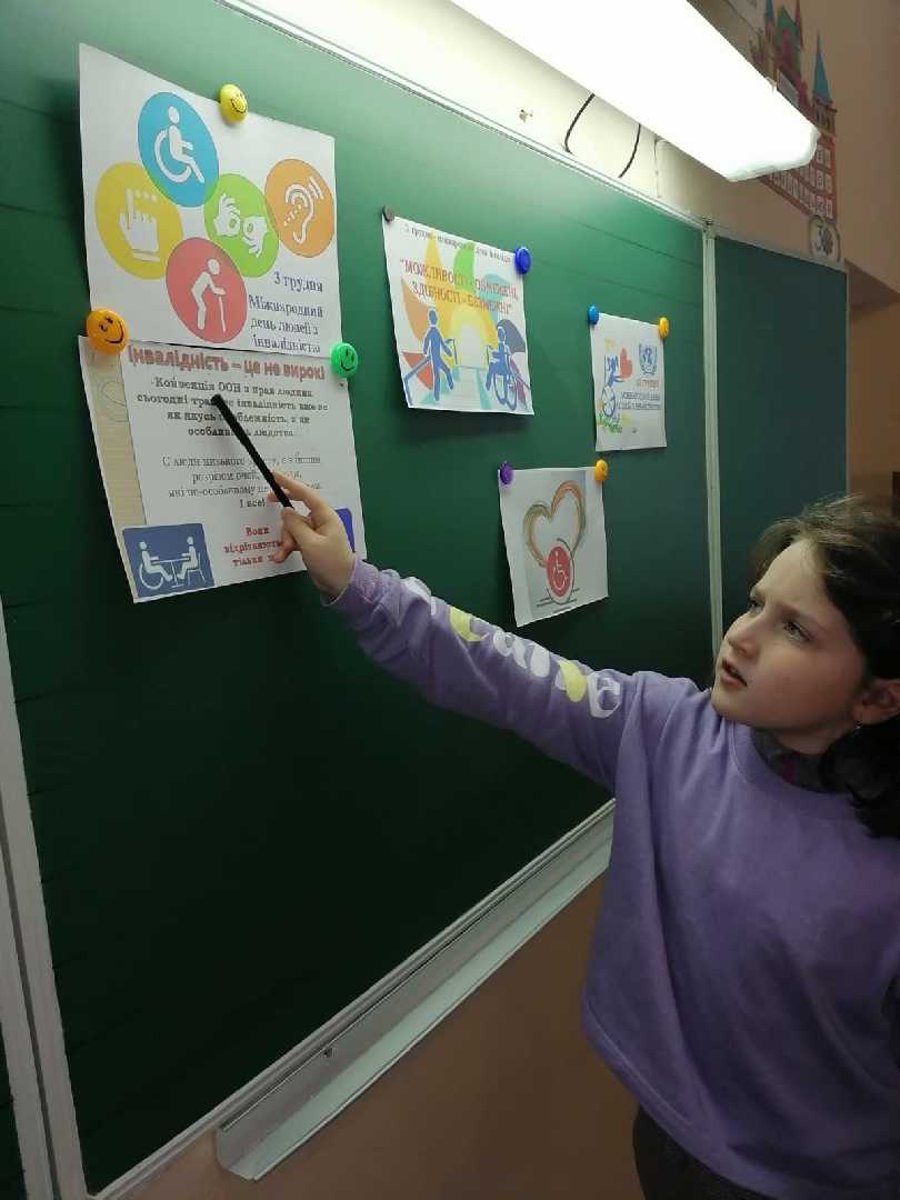 Щороку, 3 грудня разом із світовою спільнотою Україна відзначає Міжнародний день людей з інвалідністю. На їхню долю випали нелегкі випробування, однак вони, долаючи труднощі, проявляють виняткову силу духу і непохитну віру в життя. Разом з тим, як ніхто інший, ці люди потребують підтримки і заохочення, бо їхнє життя – це щоденна боротьба. Учні нашої школи також долучилися до проведення заходів з нагоди відзначення Міжнародного дня людей з інвалідністю. Метою заходів було розкрити зміст поняття “людей з інвалідністю”, виховувати здатність бачити і розуміти відмінність іншої людини від себе, спонукати до виховання доброзичливості, чуйності, взаємоповаги, терпимості і небайдужості.