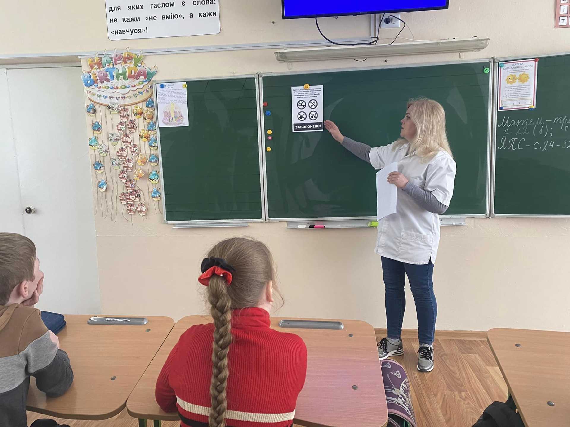 З метою привернення уваги учнів до свого здоров'я, та профілактики шкідливих звичок сестра медична Барабан Н.Я. розповіла учням 3-4х класів про те, як і коли з'явилося тютюнопаління , які хвороби викликає та про шкідливість сучасних електронних сигарет. Наголосила, що будь-яка шкідлива звичка несе за собою ряд негативних чинників, а особливо погано впливає на організм дитини. Щоб не довелося боротися з ними , краще не починати. Міцне здоров'я -це один з найбільших скарбів в житті людини. І так вистачає різних випробувань в цей не прости час. Тож бережіть себе і своє здоров'я! Ваше здоров'я-у ваших руках!
