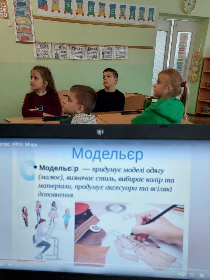 Вивчаючи тему " МОДА", учні 1-Б класу (вчитель Станасюк О.І., асистент вчителя Ковальчук Т.М.) на уроці ЯДС спробували себе у ролі модельєрів. Діти створювали свою колекцію одягу, з'ясовували, що означає бути модним і стильним. Цікавою і захопливою була екскурсія в ательє з пошиття та ремонту одягу, де кравчині п.Оля і п.Катерина розповіли про професію швачки, показали, як працюють швейні машини.