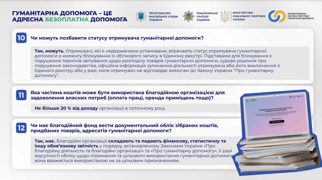 Міністерство внутрішніх справ України спільно з нацональною поліцією України та Міністерством соціальної політики України розробило роз'яснювальні матеріали, які стосуються роботи, спрямованої на запобігання та протидію шахрайству, іншим зловживанням у сфері благодійної діяльності, волонтерської діяльності, надання послуг та пільг у цій сфері та оприлюднило їх на офіційному вебсайті МВС. Інофрмація за посиланням: https://mvs.gov.ua/public/nacionalnastrategiia-spriiannia-rozvitku-gromadianskogo-suspilstva-v-ukrayini-na-2021-2026-roki/rekomendaciyi-shhodo-zapobigannia-viniknenniu-peredumov-ucinenniapravoporusen-u-sferi-blagodiinoyi-ta-volonterskoyi-diialnosti-l