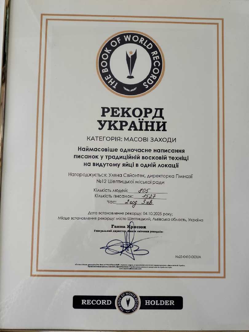 Шептицький — у Книзі рекордів! У нашому місті встановлено рекорд України із наймасовішого одночасного написання писанок у традиційній восковій техніці на видутому яйці в одній локації. Сьогодні у Гімназії №12 у Шептицькому 805 людей разом створили 1527 унікальних писанок. Вітаємо організаторів НЖТ «Прозерок», всіх учасників дійства та наше місто з рекордом!