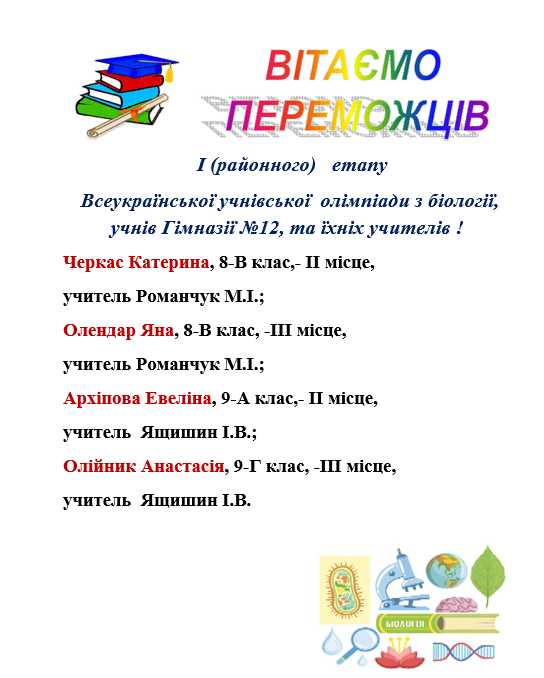 Вітаємо переможців І (районного) етапу Всеукраїнської учнівської олімпіади з біології, учнів та їхніх учителів!