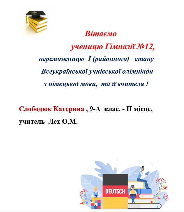 Вітаємо ученицю, переможницю І (районного) етапу Всеукраїнської учнівської олімпіади з німецької мови, та її вчителя!