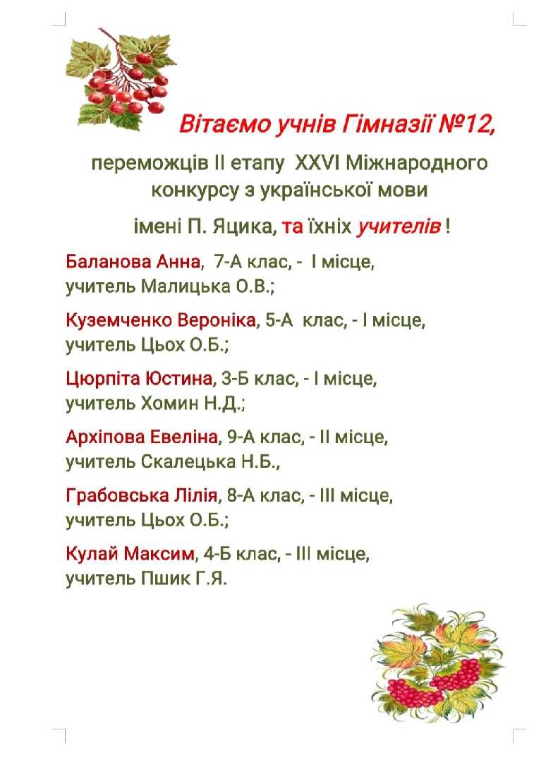 Вітаємо учнів, переможців ІІ етапу XXVI Міжнародного конкурсу з української мови імені П.Яцика, та їхніх учителів!