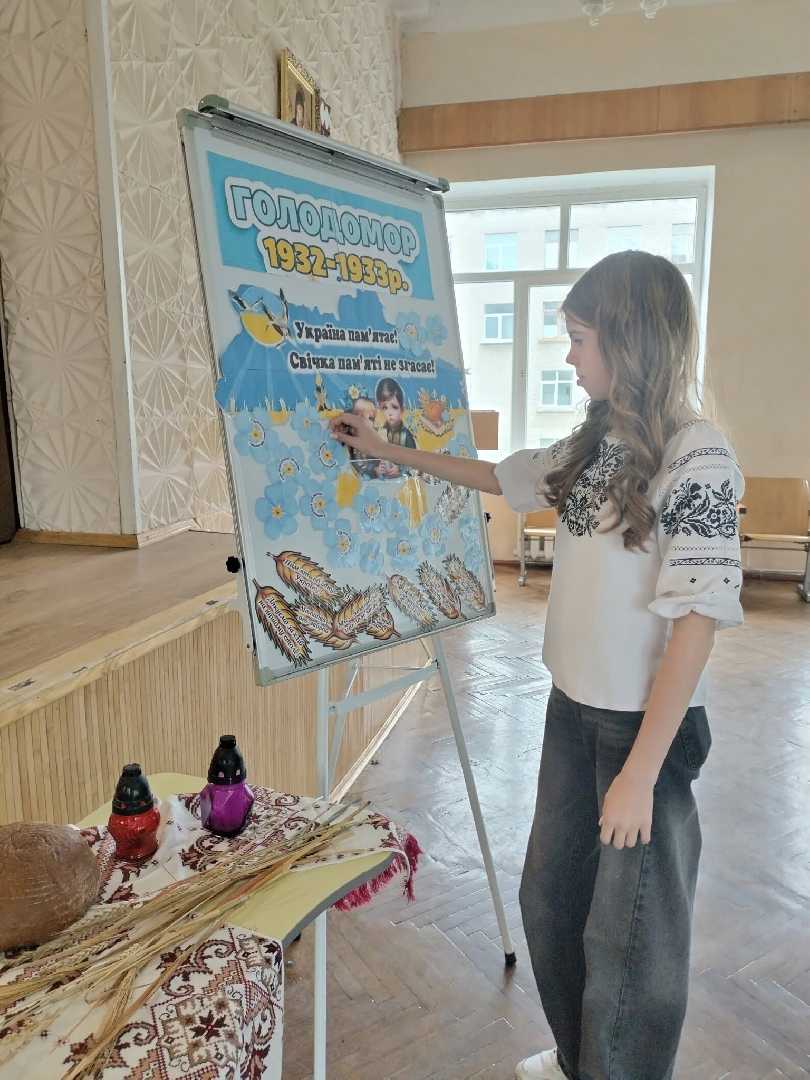 Це злочин проти українського народу, навмисне винищення, яке мало на меті зламати нашу гідність, культуру, державність. Сьогодні учні 7-В класу ( класний керівник Кашицька Н.Й.) провели тематичний захід, присвячений вшануванню пам’яті жертв Голодомору. Під час заходу учні згадали трагічні події 1932–1933 років та вшанували хвилиною мовчання всіх жертв Голодомору. Ми переконані: щоб мати гідне майбутнє, потрібно пам’ятати своє минуле.