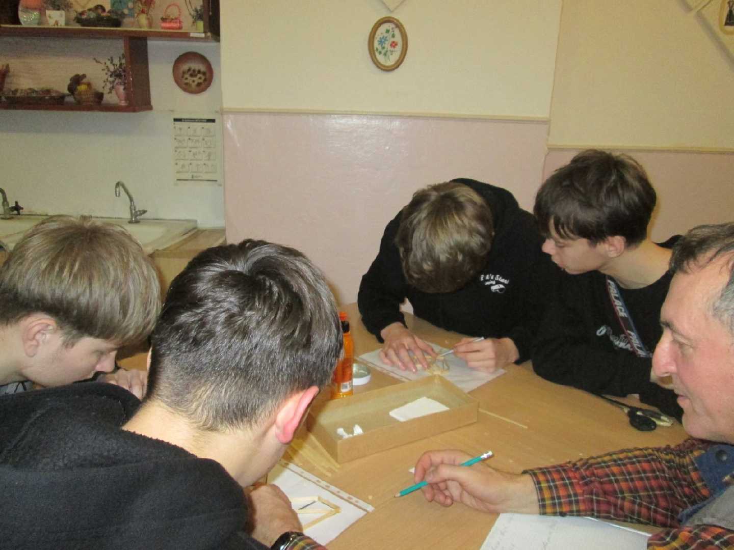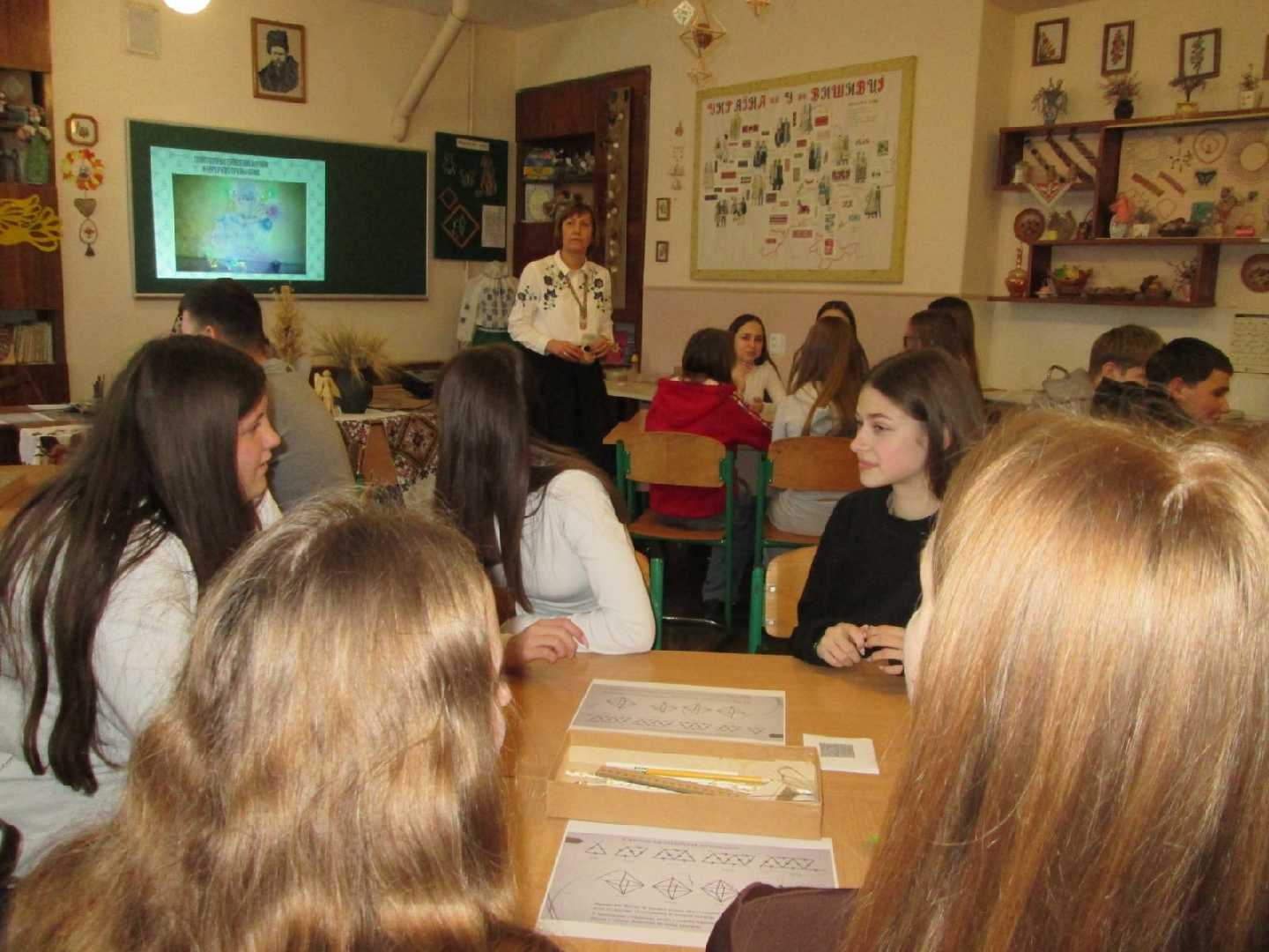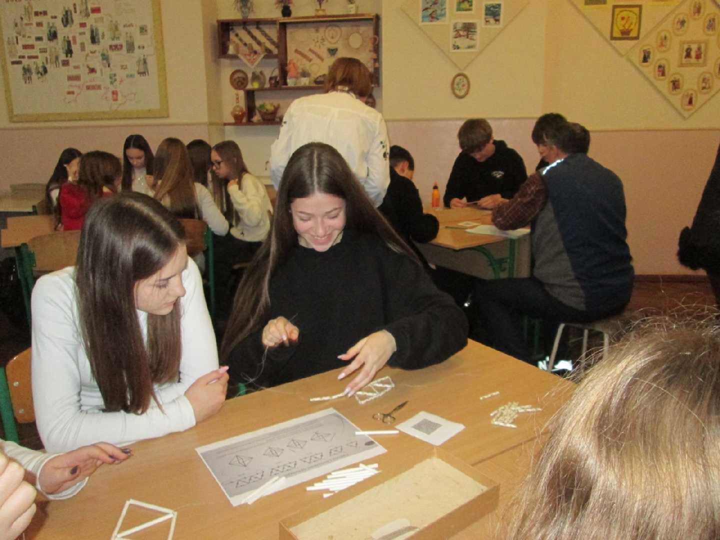 Елементи оздоблення житла, зокрема різдвяного «павука», полігональне панно виготовляли учні 9-Б класу на уроці трудового навчання, який провела учитель Гімназії №12 Мочалова Т.В. Школярі, працюючи в групах, відповідали на запитання з кошика, училися працювати з конструкційними матеріалами, виконували випереджувальні завдання, за допомогою презентації ознайомилися з різними видами декорування інтер’єру та оберегами українців, презентували власні роботи, оцінювали працю своїх однокласників.