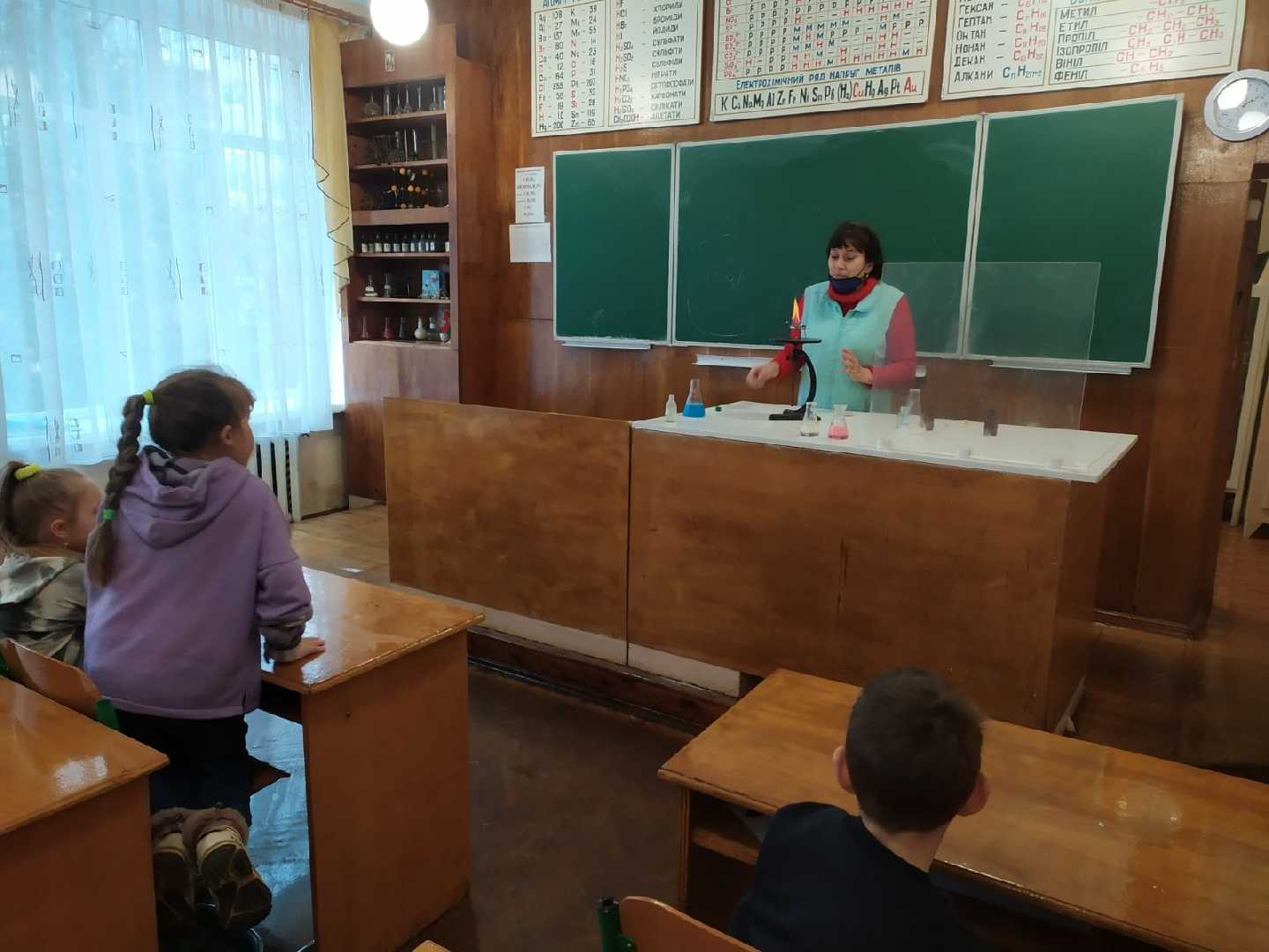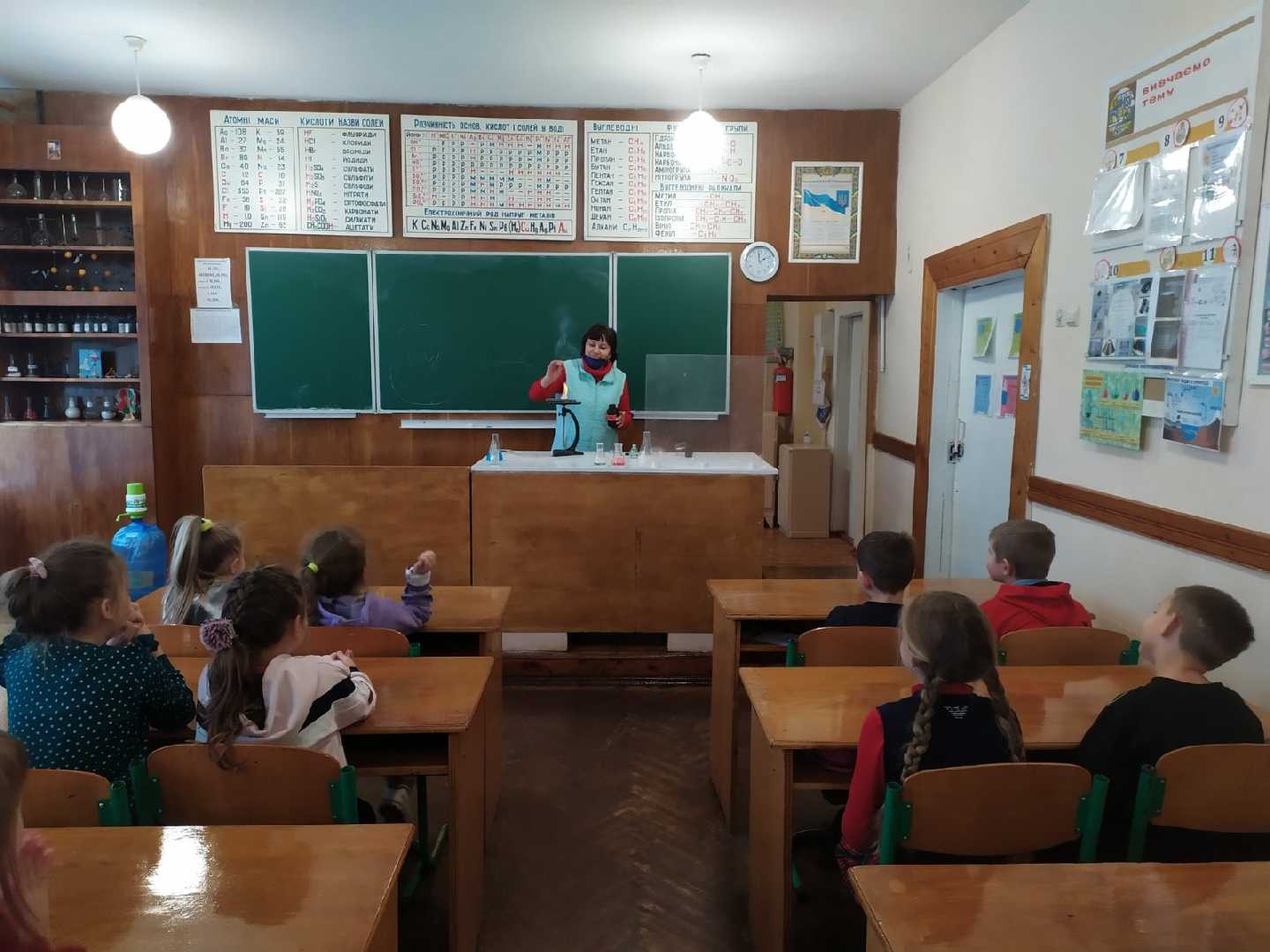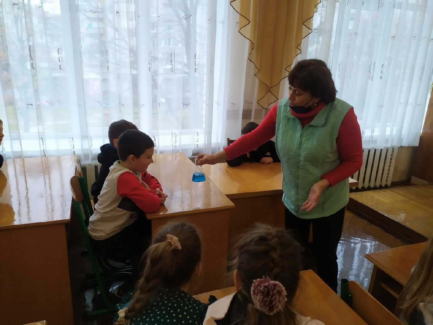 Шкільний лаборант Качмар Г. О. з радістю зустріла юних дослідників, показала лаборантську, безліч пробірок , розчинів, продемонструвала досліди. Як справжній чарівник, перетворила звичайну водичку на солодку, а потім на молоко.