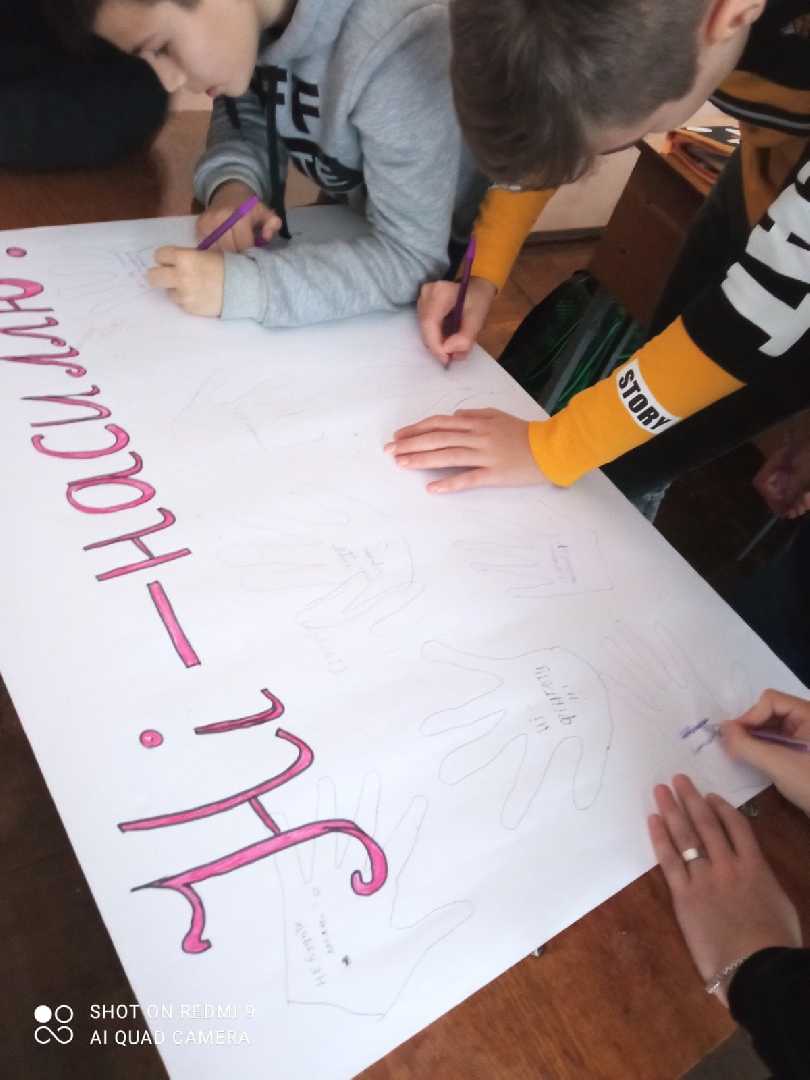 8 грудня практичний психолог ЧЗШ №12 Лесик М. М. провела для учнів 7-А класу (класний керівник Ящишин І.В.) заняття з елементами тренінгу "Ні - насильству". Обговорила з учнями, що таке насильство, які його види, та куди можна звернутися, коли виникає така ситуація. Під час заняття учні формували навички відповідальної та безпечної поведінки, вчилися толерантного ставлення до людей. А наприкінці уроку школярі створили груповий малюнок своїх долонь, де кожен написав текст, який мав би змусити замислитися над цією проблемою.