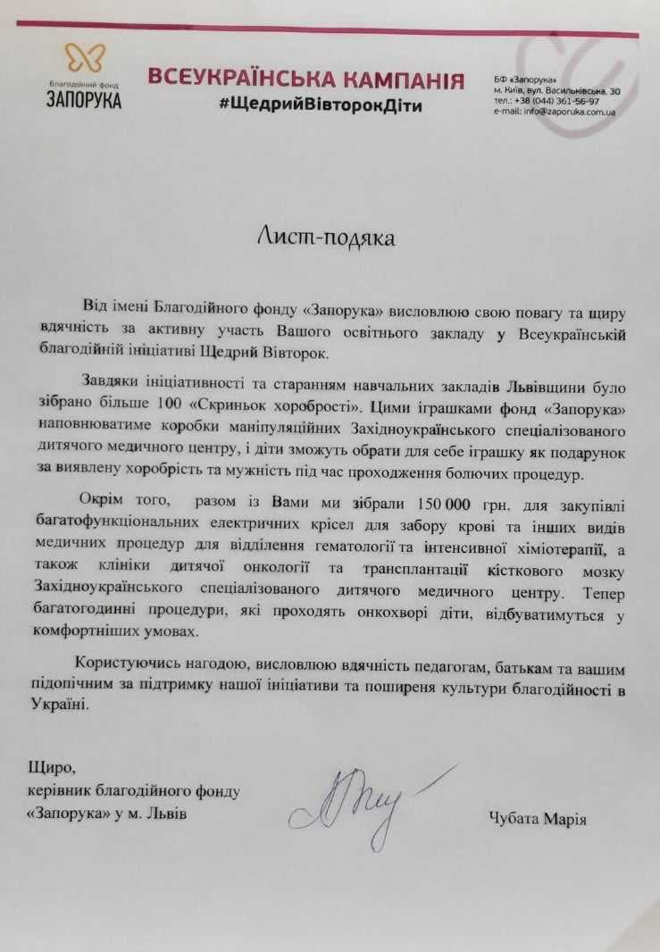Лист - подяка від імені Благодійного фонду "Запорука"
