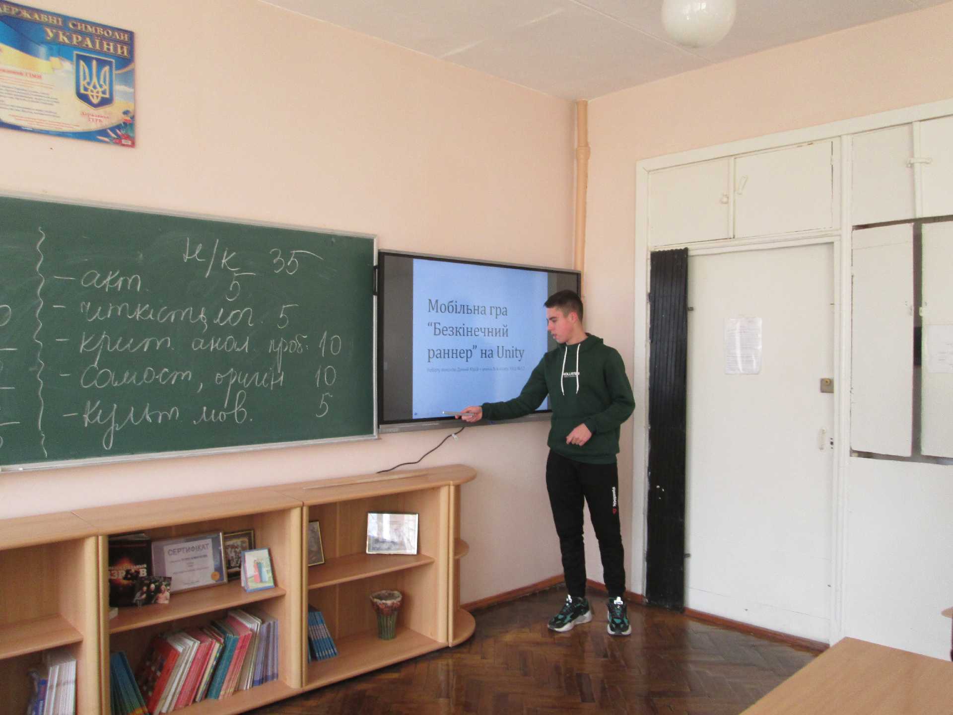 18  лютого 2022 року старшокласники презентували результати своїх науково-дослідницьких робіт ровесникам. Ящук Маґдалина-Марія (уч.ЦьохО.Б.) проаналізувала концептуалізацію опозиції «свій-чужий» у прозовому дискурсі-тексті В.Запеки «Цуцик». З історією українського жіночого руху  в Галичині ознайомила Остап Софія (уч. Шеремета І.В.). Про  матриці та їх застосування у вирішенні системи лінійних алгебраїчних рівнянь інформувала  Міщук Ірина  (уч. Осіпова О.І.). Історико-літературним аналізом поеми «Мазепа» Дж.Г.Байрона та її літературним перекладом Д.Загули зацікавила слухачів Лотоцька Анастасія  (уч. Сідельник О.М.). Дикий Юрій  (уч. Дилин Н.О.) презентував, створений ним у середовищі Unity,  безкінечний раннер.