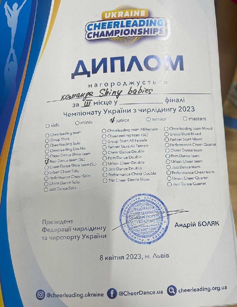 Вітаємо команду Гімназії №12 з чирлідингу «Shiny babies» (керівник Меда Л.В.) із ІІІ місцем у фіналі Чемпіонату України з чирлідингу 2023.