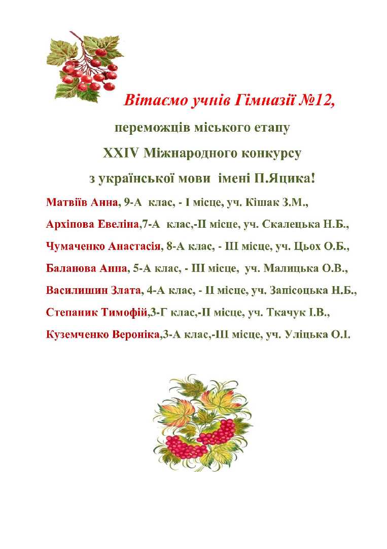Щиро вітаємо переможців міського етапу Міжнародного конкурсу з української мови ім. П. Яцика!