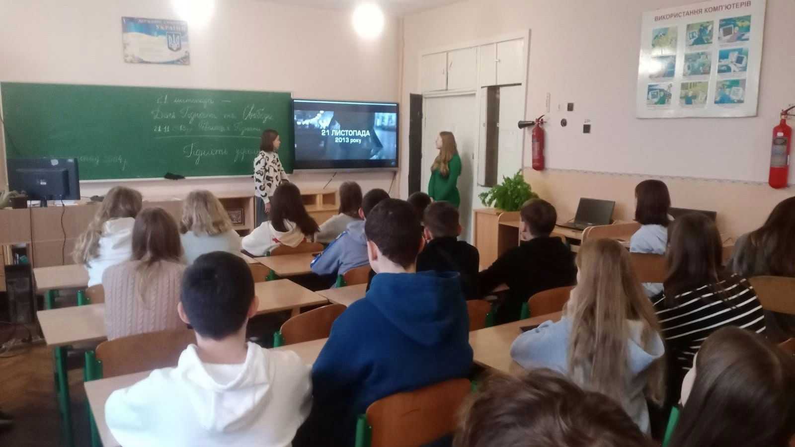 Україна - територія гідності та свободи. Саме під таким гаслом учні 8- Б класу (кл кер. Малицька О. В.) вшанували патріотизм та мужність українців, які постали на захист демократичних цінностей, прав та свобод людини. Школярі обговорили доленосні події в Україні, з'ясовували поняття гідності українця, щоб утвердити свою громадську позицію.