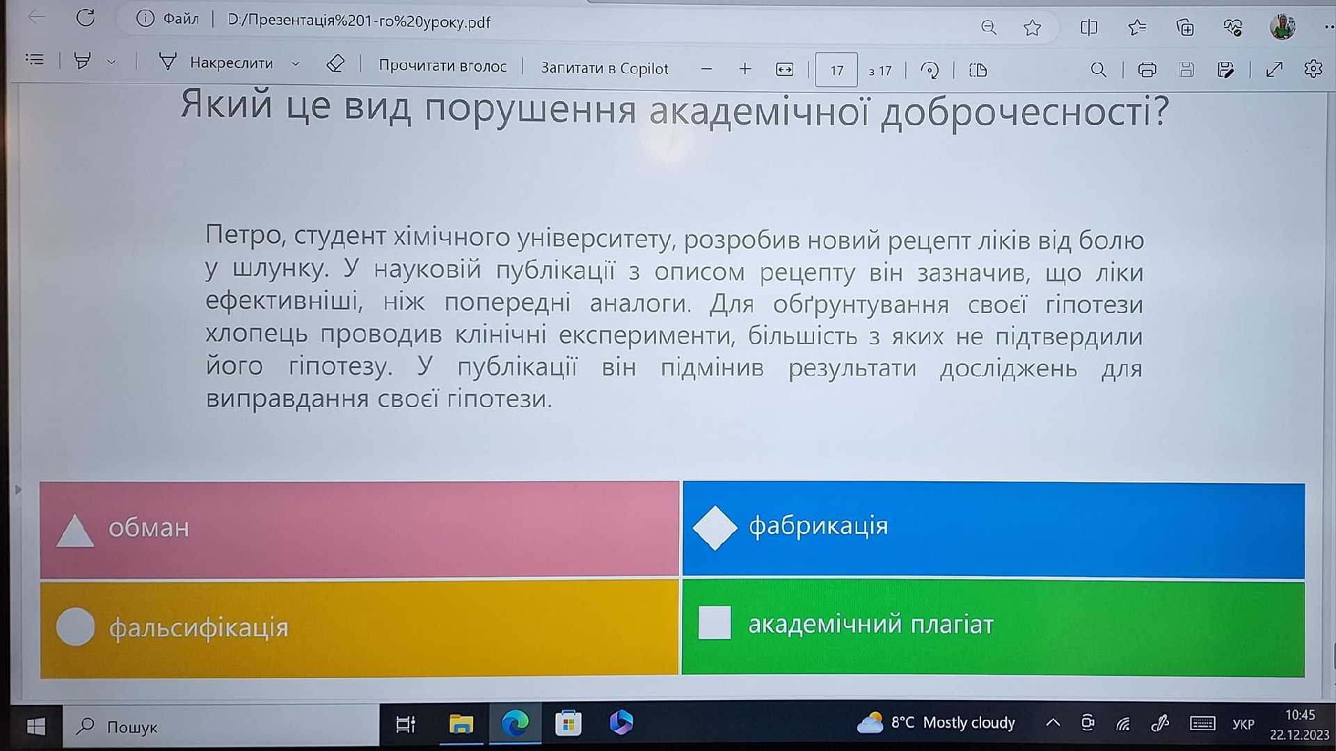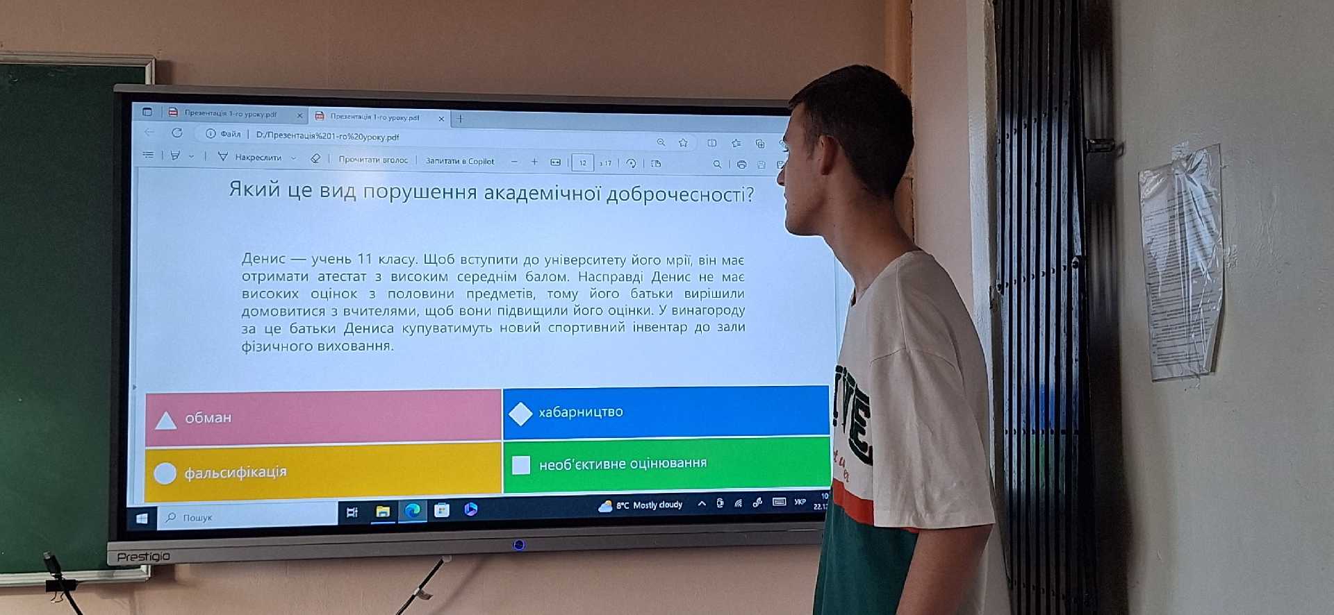 Цього року Гімназія 12 почала активніше працювати над впровадженням доброчесності в нашому освітньому середовищі. У жовтні ми відвідали тренінг про доброчесність, що відбувся за спряння Офісу доброчесності НАЗК, громадської організації "Вокс Україна", Української академії лідерства, Антикорупційної ініціативи Європейського Союзу в Україні (EUACI). Сьогодні ми, використавши матеріали тренінгу, говорили про доброчесність із нашими дев'ятикласниками.
